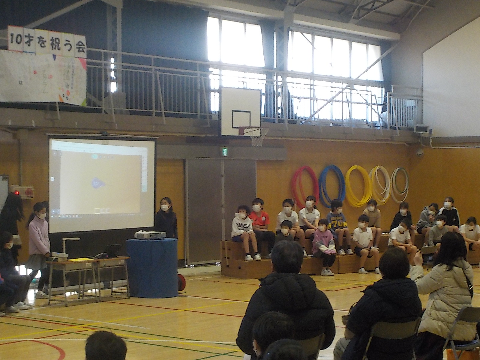 4年生が10歳を祝う会を開催しました。保護者の方をお招きし、成長の様子を「できるようになったこと」や「呼びかけ」で披露しました。グループごとに長縄連続跳びやPCのタイピングなどを披露し、会の運営も自分たちで進めました。