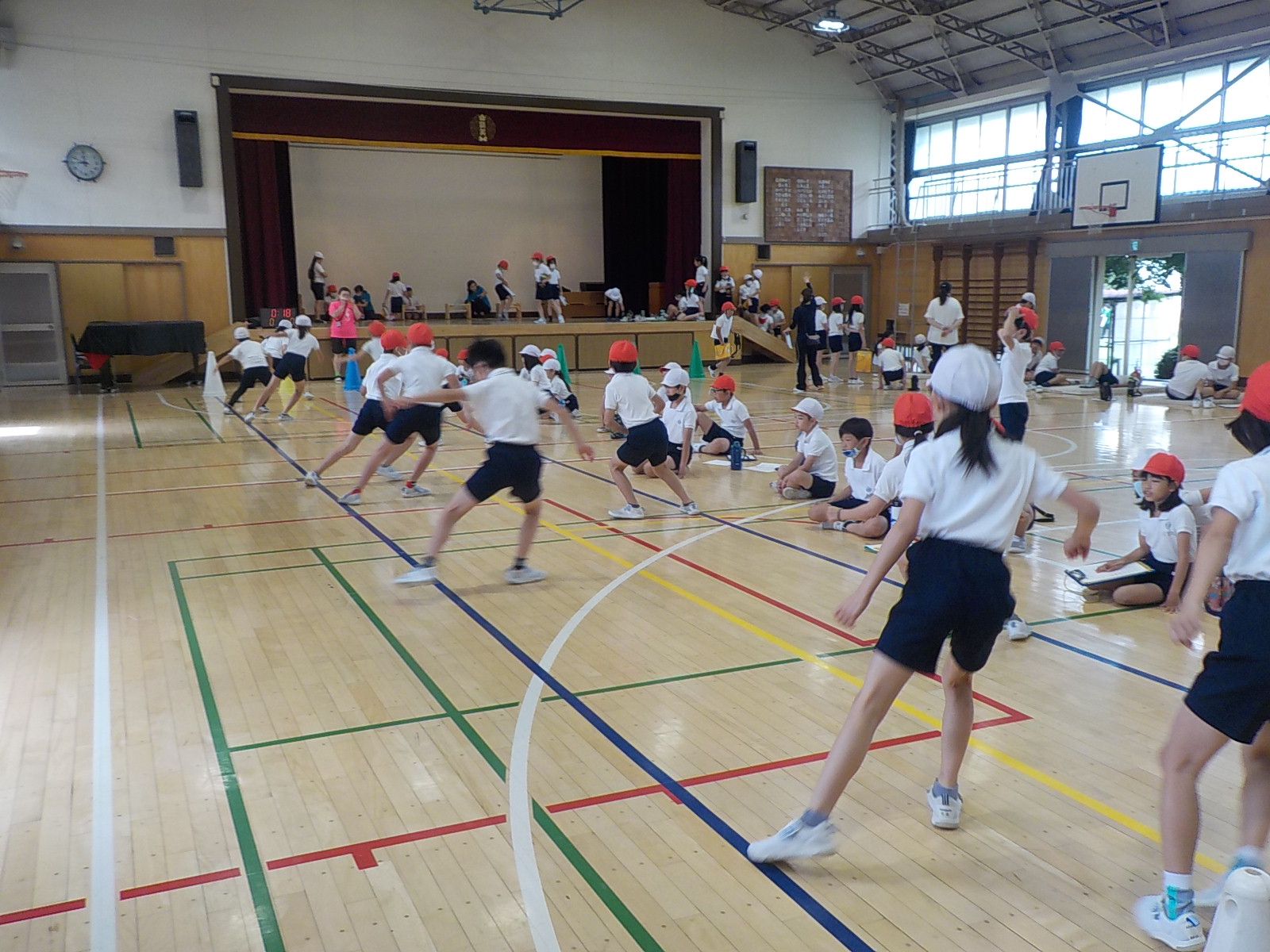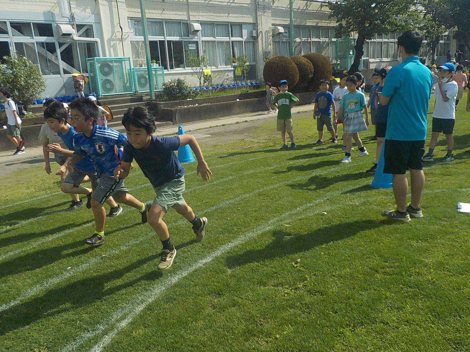 運動会に向けて、朝の10分間にかけっこの練習をしています。1年生から6年生までだれでも参加できます。毎朝30人ぐらいの子ども達が集まり、校庭を全力で走っています。走り方を考えて工夫したり、友達と競走したり、運動会に向けてやる気があふれています。