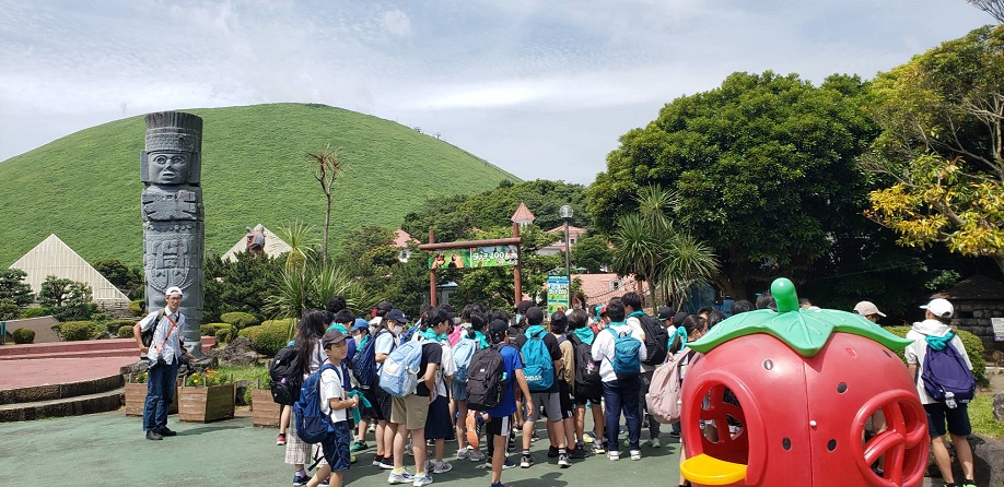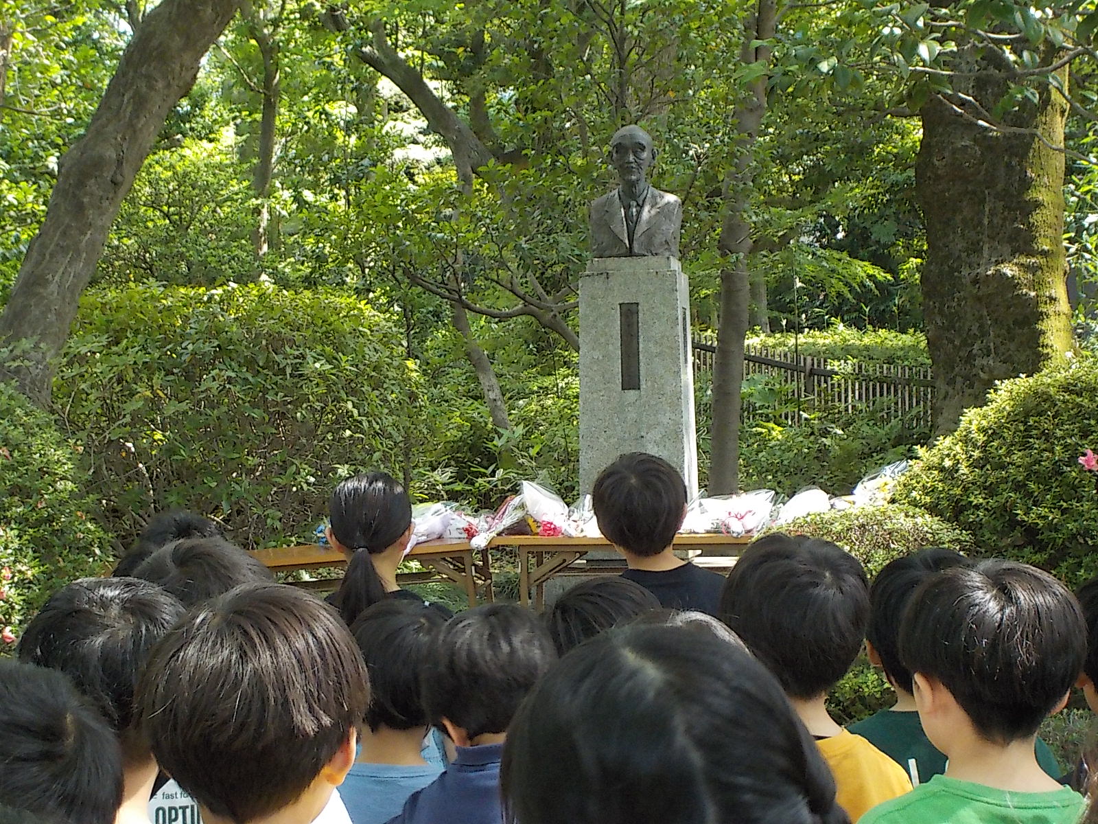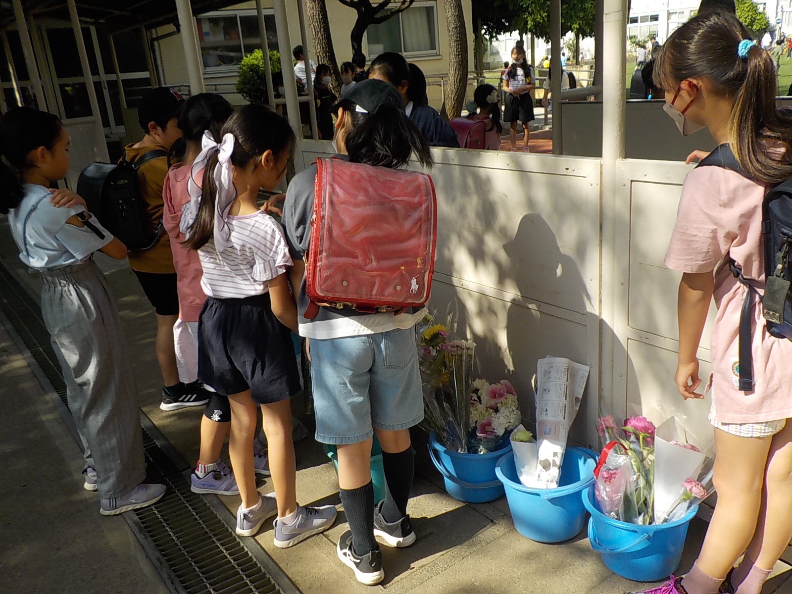 6月1日は、本校の創立に深くかかわりのある今井政吉先生の命日です。この日に、済美小学校は毎年教育センター内の今井先生の銅像に献花をします。全校児童が持ち寄った花束を3年生が代表で献花し、今井先生への感謝の気持ちを表しました。