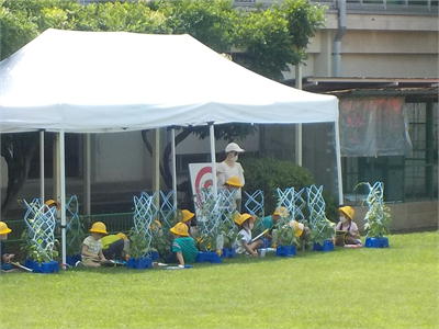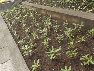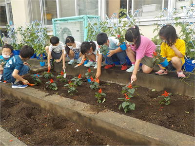 7月6日 2年生花壇植栽 梅雨の晴れ間となった、6日2年生が職員室前の花壇の植栽を行いました。例年なら親子ガーデニングとして行う活動ですが、今年はコロナの影響で児童のみでの活動です。また、4日には地域の千日紅同好会の方により、千日紅を植栽していただきました。もうかわいらしい紅色の花が咲き始めています。これからが楽しみです。