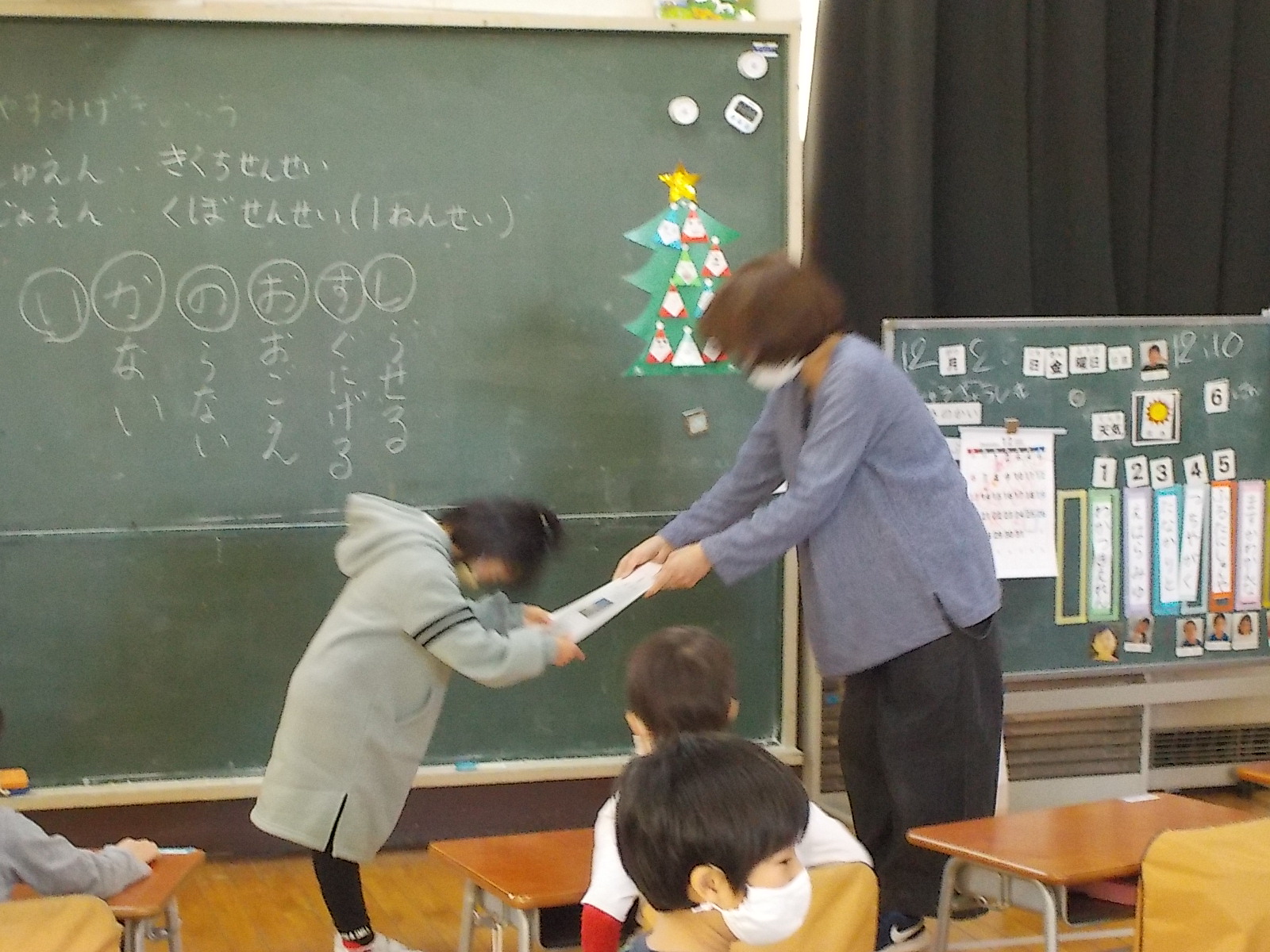 12月25日 2学期 終業式 本日の終業式をもって、2学期が終わります。各クラスでは担任の先生から一人一人通知表を渡され、2学期の学習生活を振り返りました。下校の際は校門で大きな荷物を抱えながら「よいお年を!」声を掛け合う姿が見られました。いよいよ明日から、12日間の冬休みが始まります。