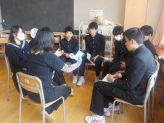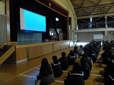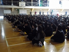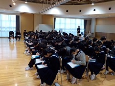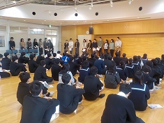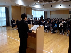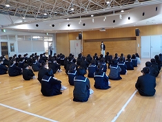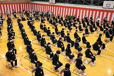 放送で修了式を行い、2年生は卒業式で使用した体育館で、1年生は多目的室で学年集会を行いました。