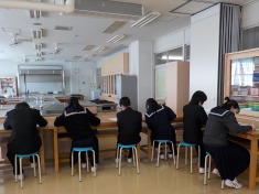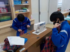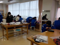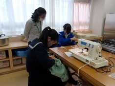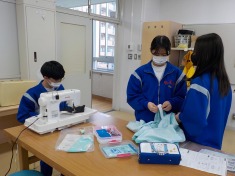 2年生家庭科の授業の様子。ミシンを使ってハーフパンツ作りをしています。