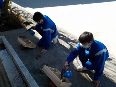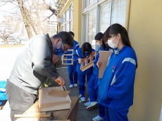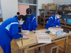 1年生技術で棚を作成中。ガスバーナーを使い、色付けをしていました。