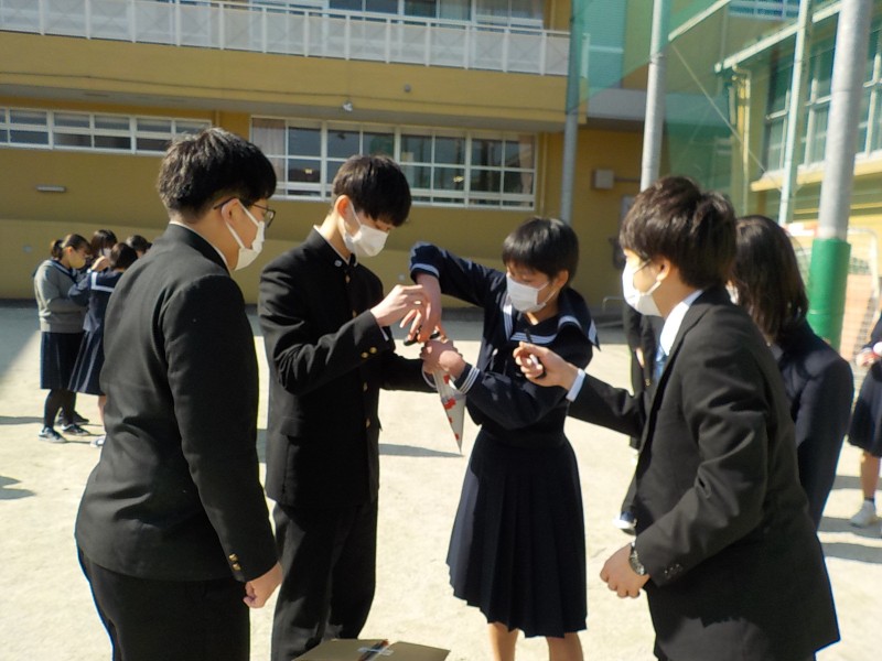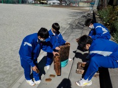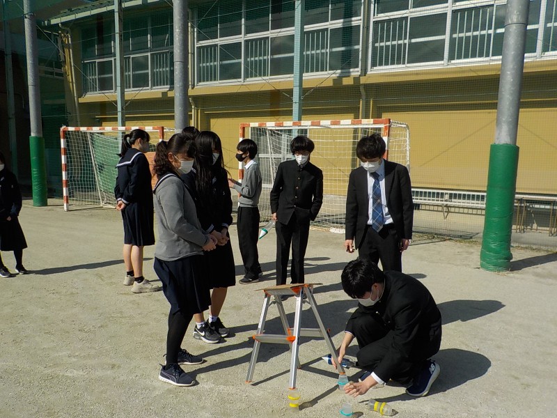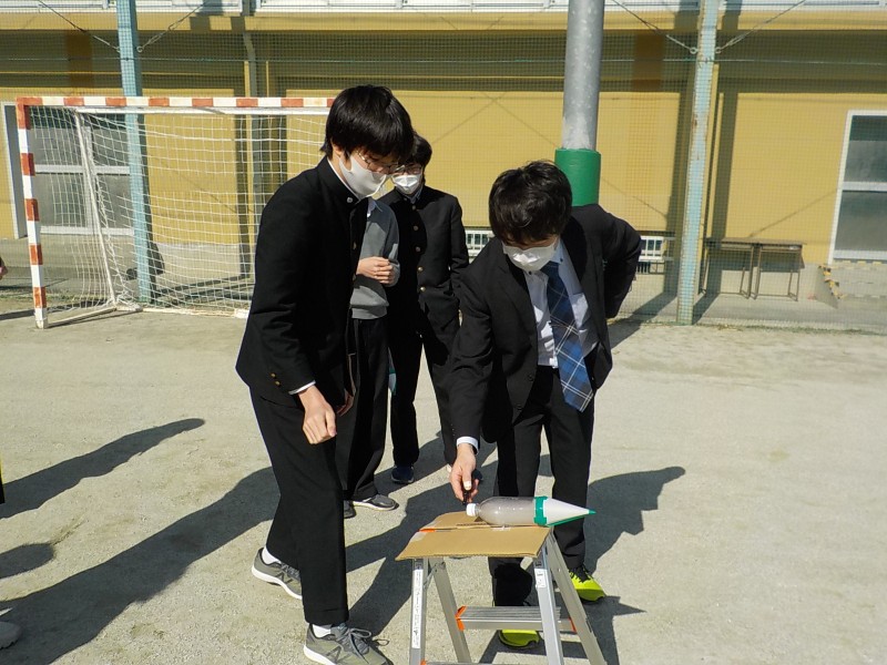 3年生理科の授業で、エタノールを使用したペットボトルロケット実験を行っていました。風が強く大変そうでした。