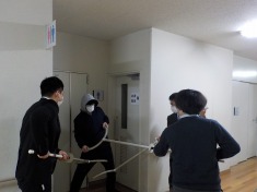避難訓練の様子。今回は不審者侵入を想定して行いました。