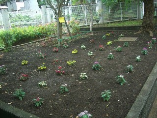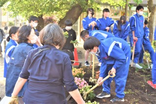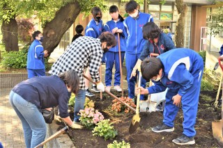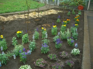 【花植えボランティア】昇降口の花壇に花を植えました。