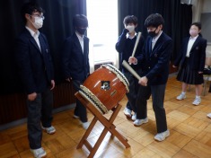 【音楽(2年生)】昨年度の箏に引き続き、日本の伝統楽器・和太鼓に挑戦しました。