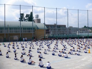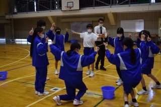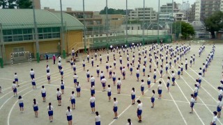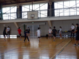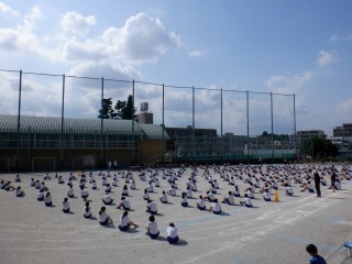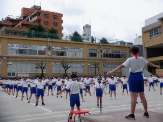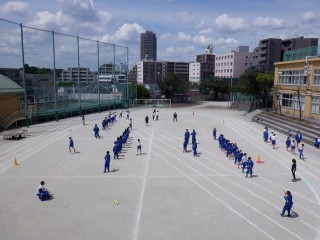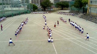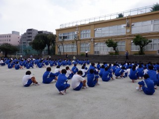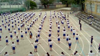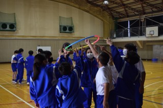 【運動会全体練習①】2週間後の運動会へ向けての練習が始まりました。今日は全校生徒でソーシャルディスタンスを守っての集合とラジオ体操、大なわとびの練習をしました。