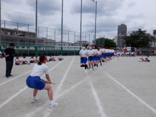 【体育】本日は晴れ晴れしい天気で、1年生が大繩の練習に励んでいました。