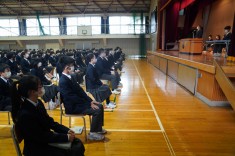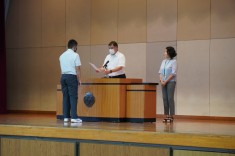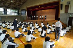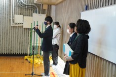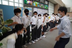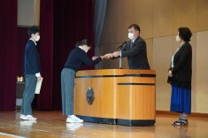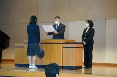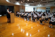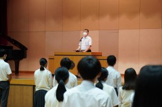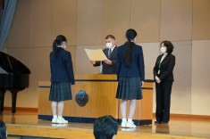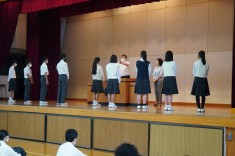 【朝礼で表彰が行われました】バドミントン部と英語部が表彰されました。