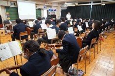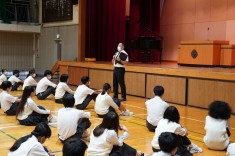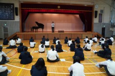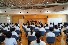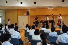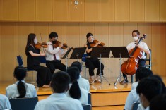 【出張音楽鑑賞教室(1年生)】日本フィルハーモニー交響楽団の弦楽器奏者の方々にいらして頂きました。クラシックをはじめジブリ、ディズニー、曲当てクイズとバラエティに富んだ演奏に生徒も楽しみながら鑑賞しました。
