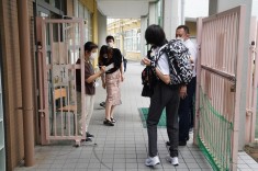【生徒会役員選挙 朝の挨拶】生徒会役員選挙に出る生徒たちが、朝の挨拶運動をしています。