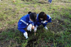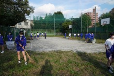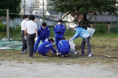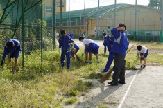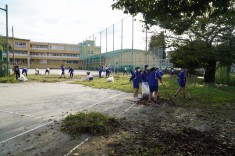 【草刈りボランティア】夏休みの間に茂った雑草を、ボランティアの生徒が片付けていました。