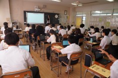 【授業見学 1年英語】1年生はラウンド形式で教科書を進めています。デジタル教科書を使いながら、英文を順番通りに並べていました。
