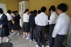【修学旅行準備】11日から始まる修学旅行の荷物を輸送するため、3年生が朝から大きなバッグを持って登校しました。