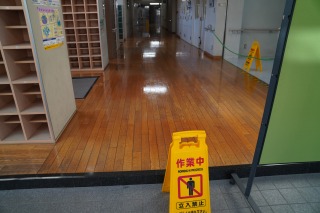 【校内のワックスがけ】用務主事の皆さん方で冬休み中に校内をワックスがけしました。ピカピカに光る廊下になりました。