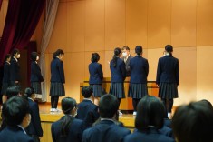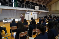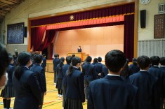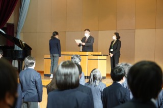 【3学期始業式と表彰】本校体育館で3学期始業式が行われました。あわせてバドミントン部1年女子が都大会優勝で表彰されました。
