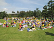 芝生に広がって一方向を向いて、楽しみにしていたお弁当を