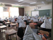 今日の避難訓練は、「予告なし 休み時間の地震発生」を