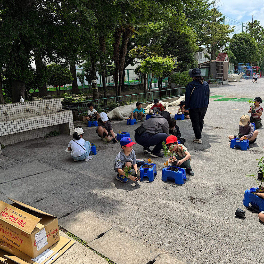 5月8日(木)の1校時の昇降口前では、2年生の子どもたちが苗を自分の鉢に植え替えていました。先生が、こんなやり方もあるよと一般的な方法を教えた後、自分なりに工夫してごらんと話していました。見ていると、どの子も慎重に苗を大切に扱っていました。1つの方法を教え込むのではなく、例を示してチャレンジさせるという手法は素晴らしいと思いました。苗が大きく育つのを子どもたちと一緒に楽しみにしています。