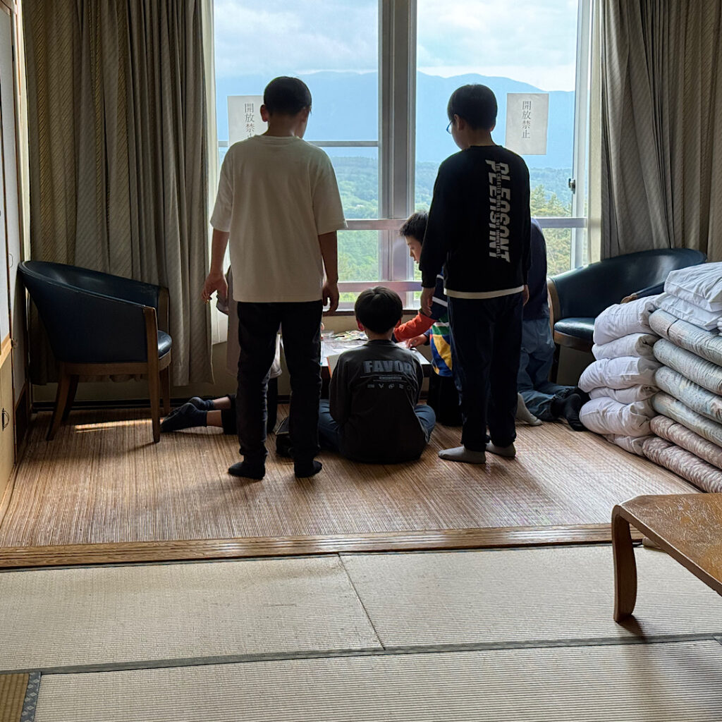 開校式です。ホテルの方のお話をいただき、これから避難訓練、入浴へと続きます。夕食までの間、各自お部屋でゆっくりしています。