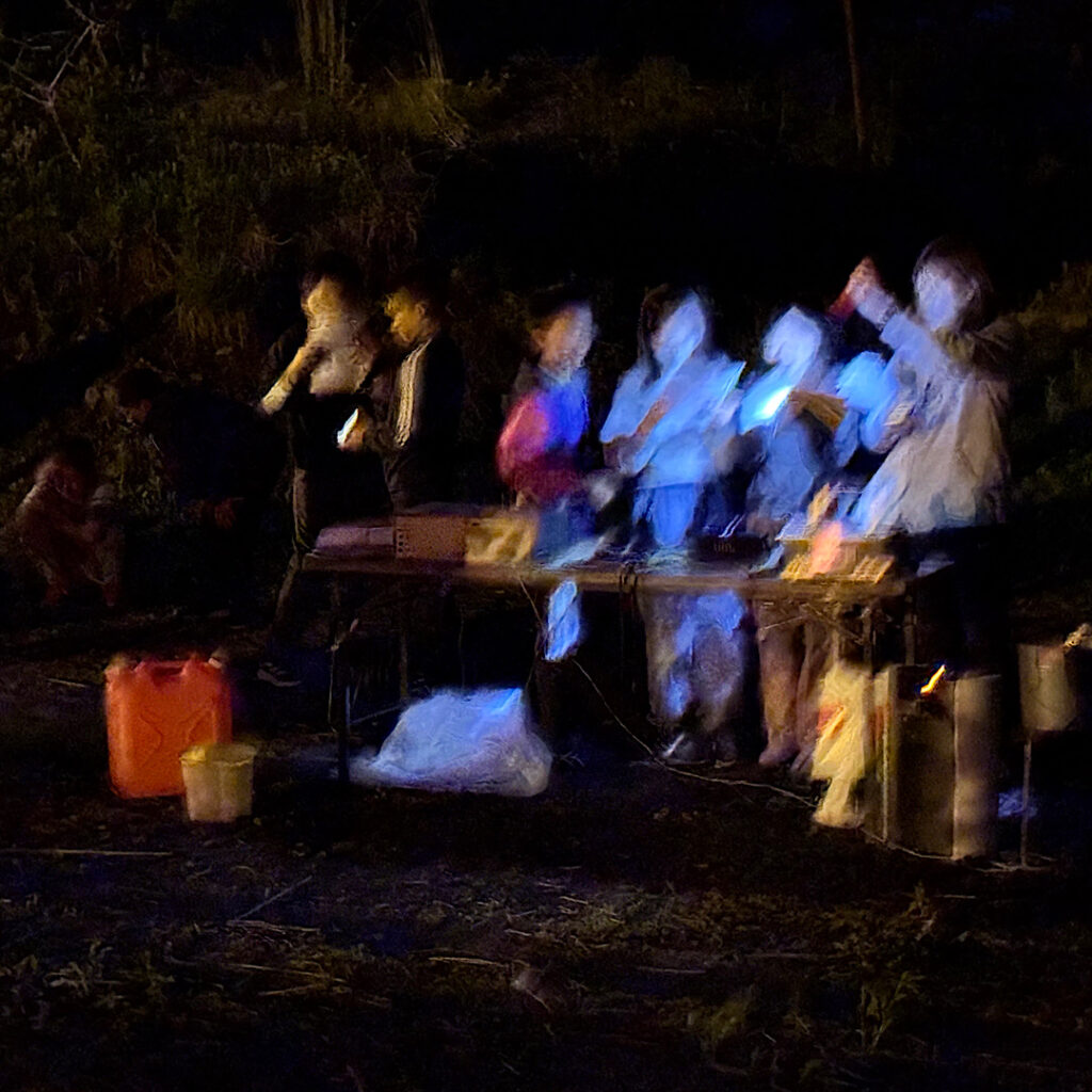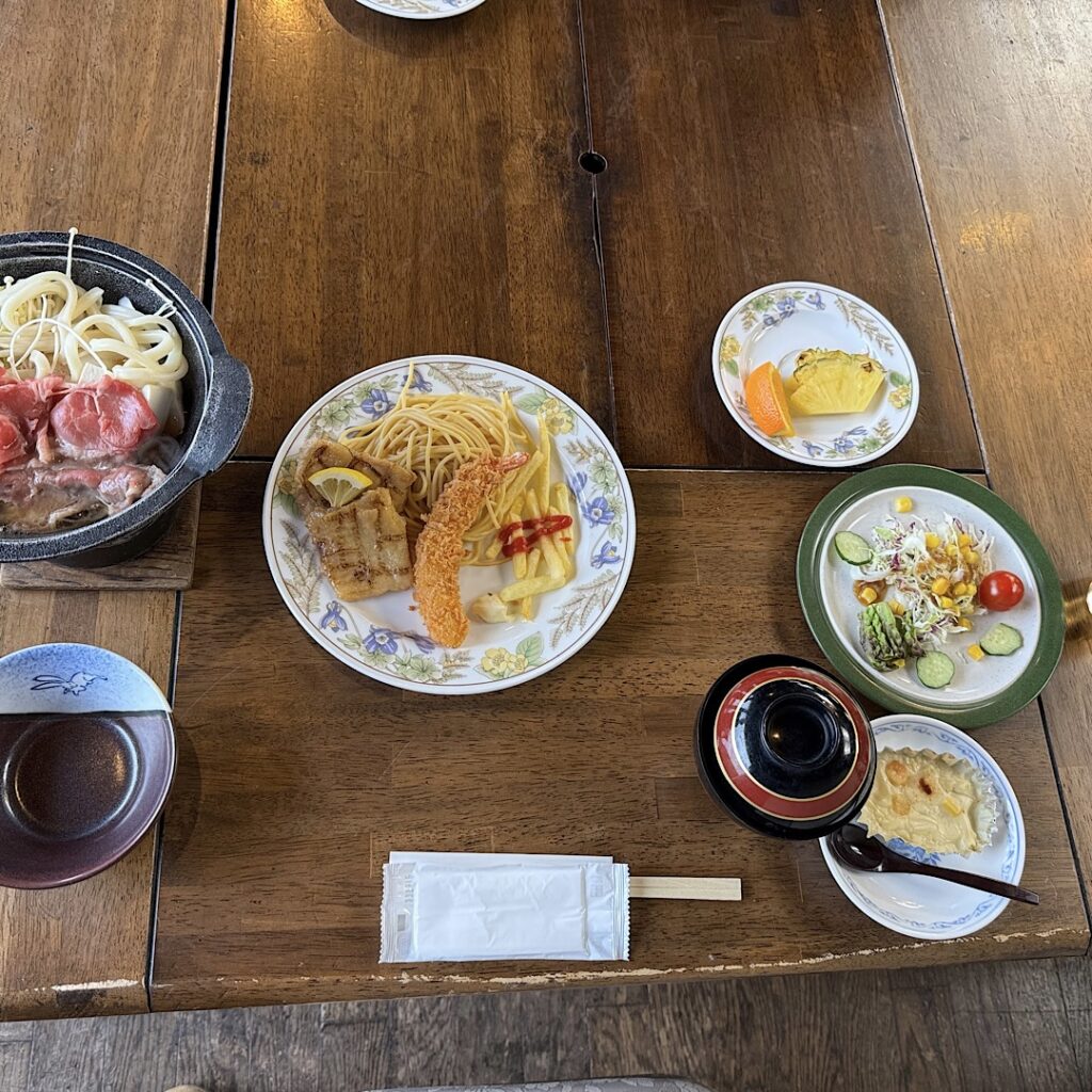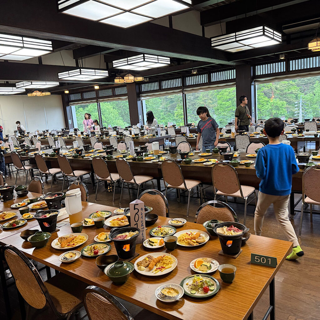 食事係が準備をしてくれています。カレーライスがまだお腹に残っている子が多い中、豪華な夕食が用意されていました。子どもたちは元気そうなので、たくさん食べてくれることでしょう。