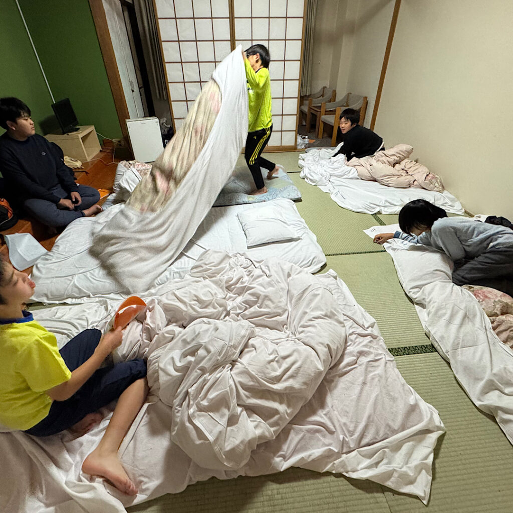 消灯時間前の男子部屋です。お布団の準備はかなり前から行っていたようです。このままぐっすり眠って明日に備えてくださいね。