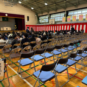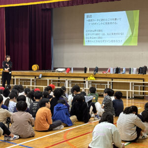 室内レクが始まりました。最初は4つのグループに分かれたハンカチ落としです。6年生の本気のハンカチ落としはなかなかの迫力がありました。続いてのジェスチャーゲームは演者のサービス精神のおかげで、大盛り上がりになりました。司会の子どもたちのレベルの高さや音響効果の巧みさで、大人が見ても爆笑できました。男女の仲も良く、この学年の子どもたちの真骨頂を見た気がしました。