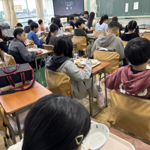 二日目の夕食です。なんとデザートにエクレアが出ています。移動教室にエクレアが出るなんて、時代が変わったなぁとお爺さんのような感想をもちました。子どもたちは、嬉しいですよねー。