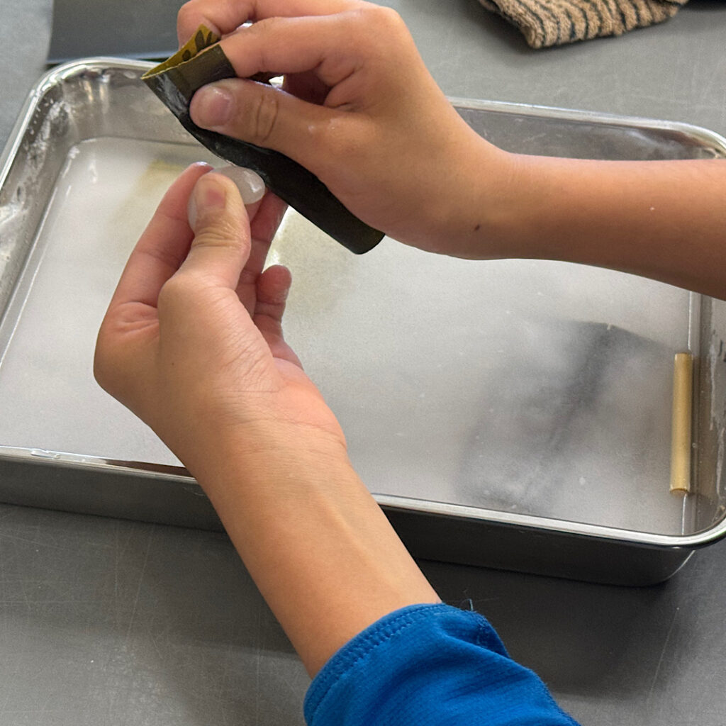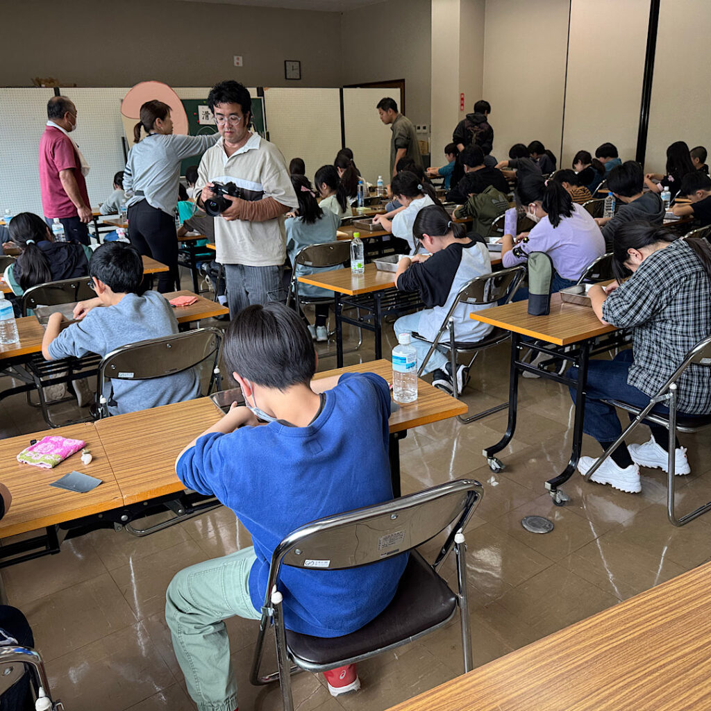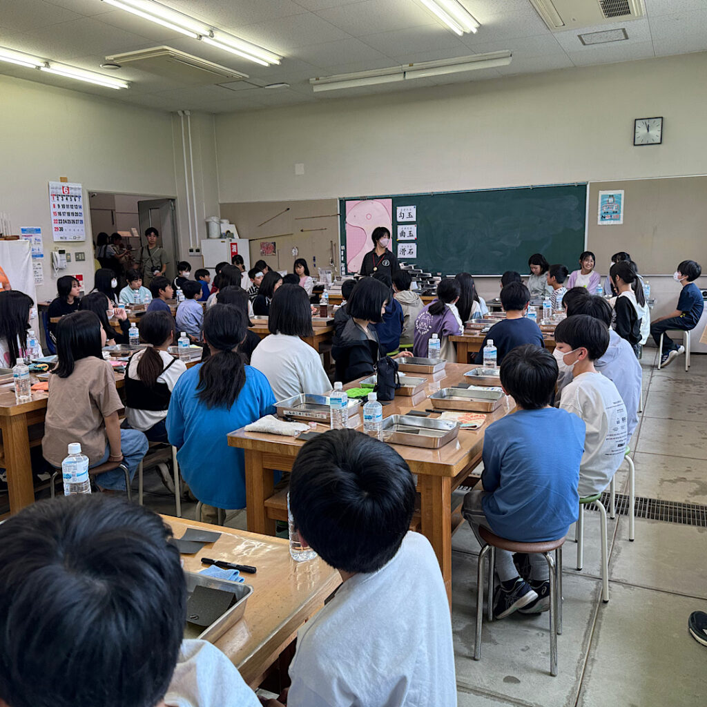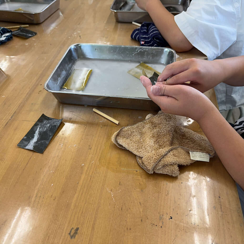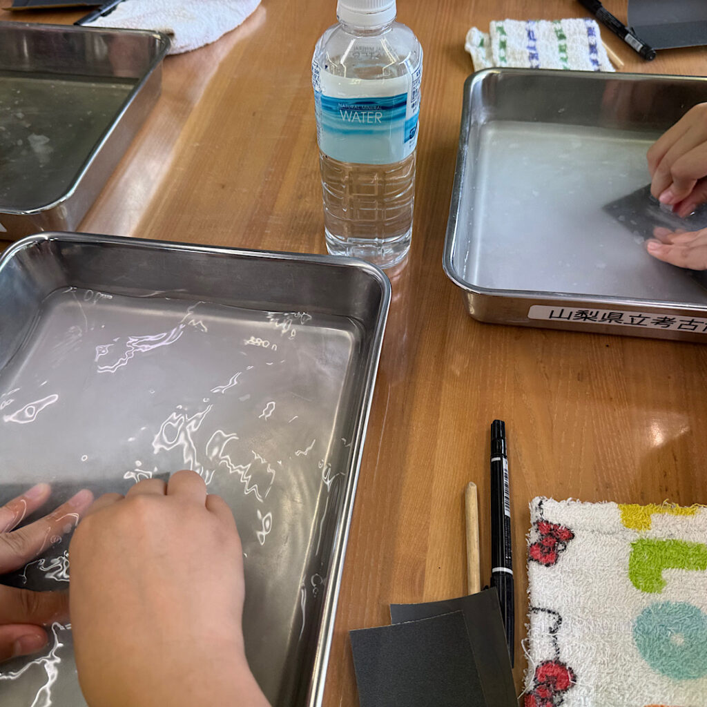 勾玉作りが始まりました。勾玉とは何なのかというレクチャーを受けた後は早速作業に入りました。子どもたちは、消しゴムを削るようにどんどん進めて行きます。丁寧に教えていただいているので、みんな成功しそうです。これも良いお土産になりそうです。