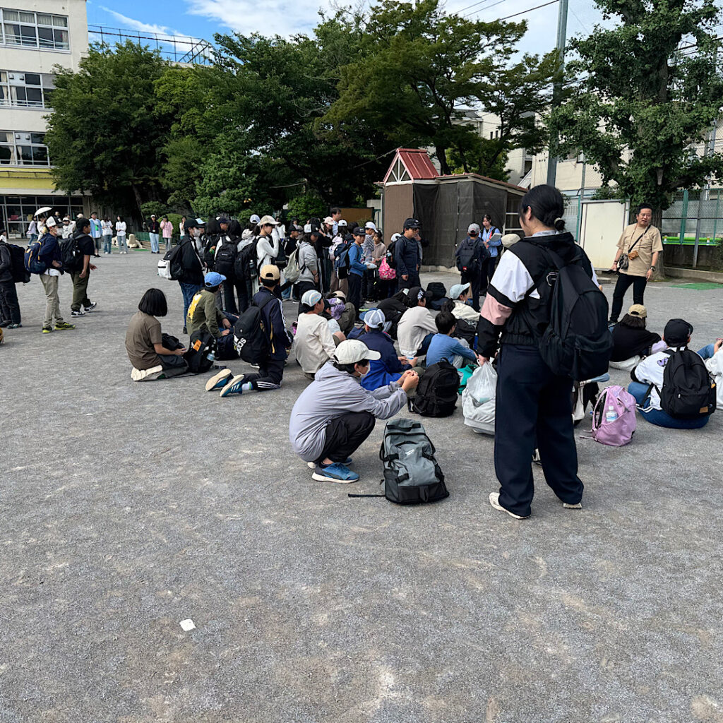 三日目の朝です。気持ちの良い青空が見られます。朝会の後、学年写真を取ろうと頑張って並んでいます。