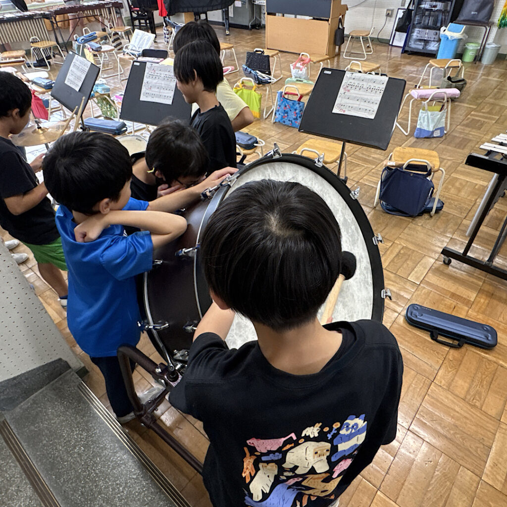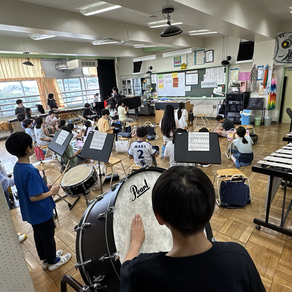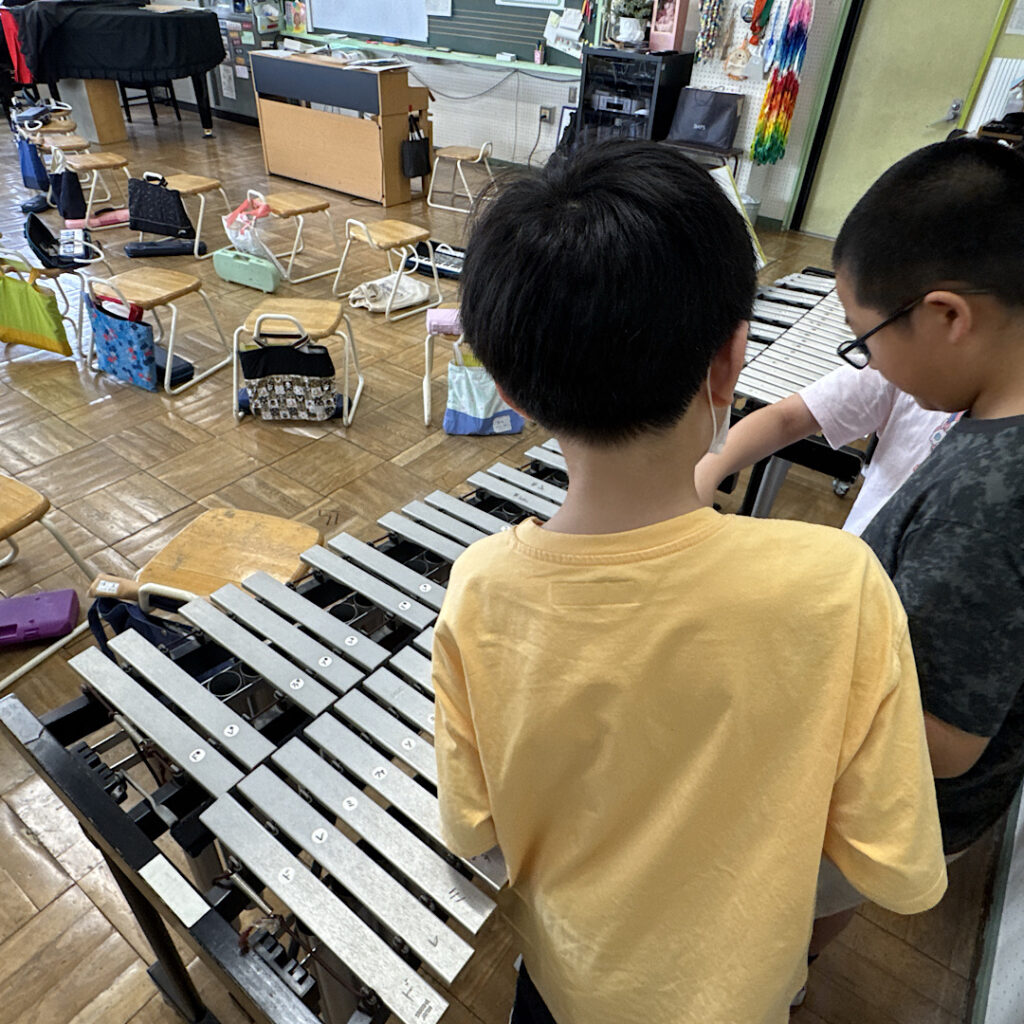 6月12日(木)3校時の音楽室では、5年3組の子どもたちが音楽の授業に取り組んでいました。最初の「今日の日はさようなら」を聞くと、子どもたちのやる気がみなぎっていることを伝わってきました。次の合奏では、「キリマンジャロ」という曲で太鼓や打楽器、エレクトーンなどで演奏し、それを録音してみんなで振り返っていました。その振り返りを課題にして、楽器ごとに練習に励んでいました。どのグループも同じ課題をもっているため、教え合いが活発に行われていて、子どもたちが自ら学ぶ音楽の授業が見られました。2回目の演奏を聴き合うと、素人目にも分かるくらい演奏の質が高まっていました。