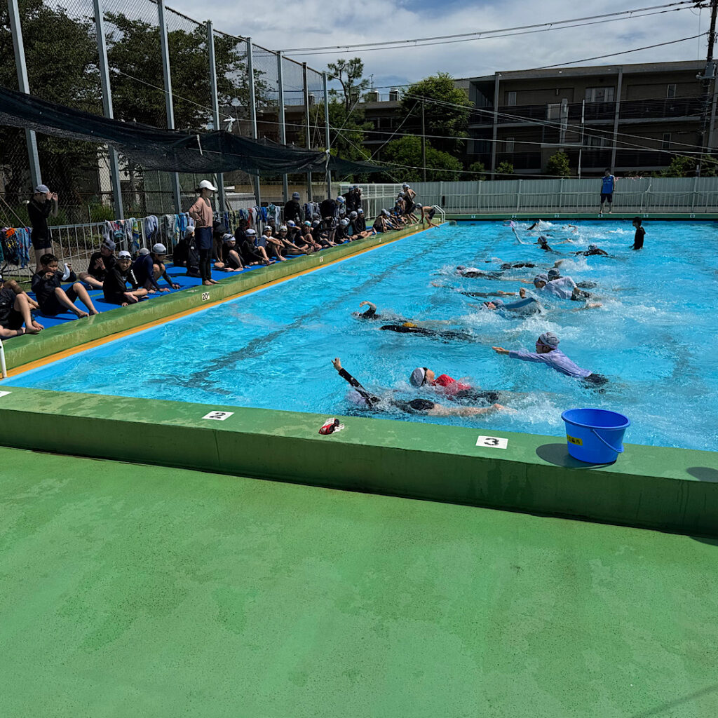6月26日(木)5.6校時には、6年生がプールで水泳の学習に取り組んでいました。最初はプールの横を使ってクロールの手のかきをペアの友達と見合っていました。後半はプールの縦を使って長い距離を泳いでいました。暑い中で気持ちよさそうに泳いでいました。