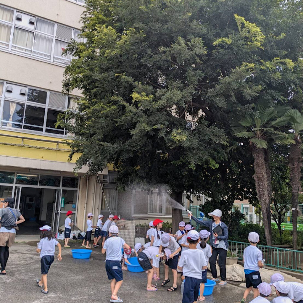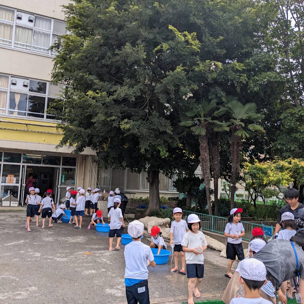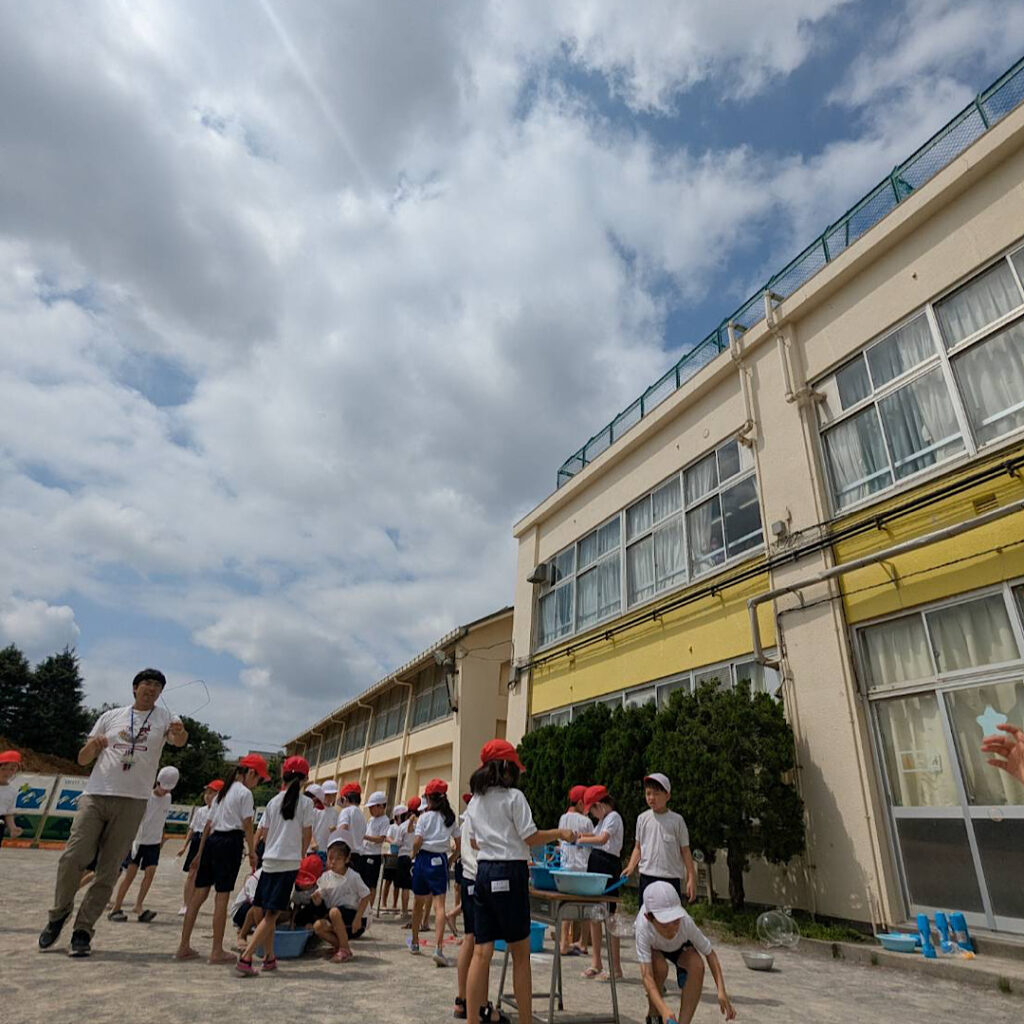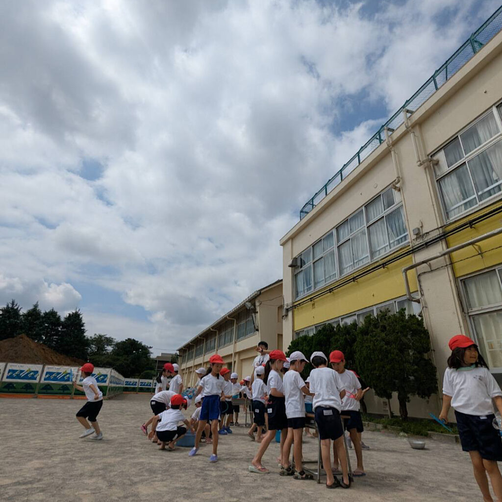 7月4日(金)の1.2校時、1年生は校庭に出ていて楽しそうでした。身の回りのものが遊び道具に大変身!みんなで水をかけ合ったり、色水を作ったりして夏を楽しみました。