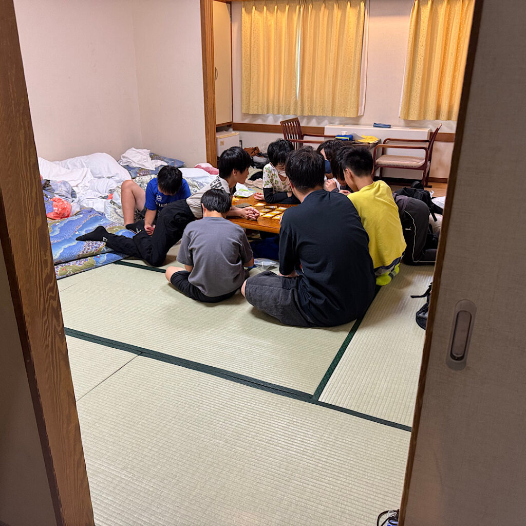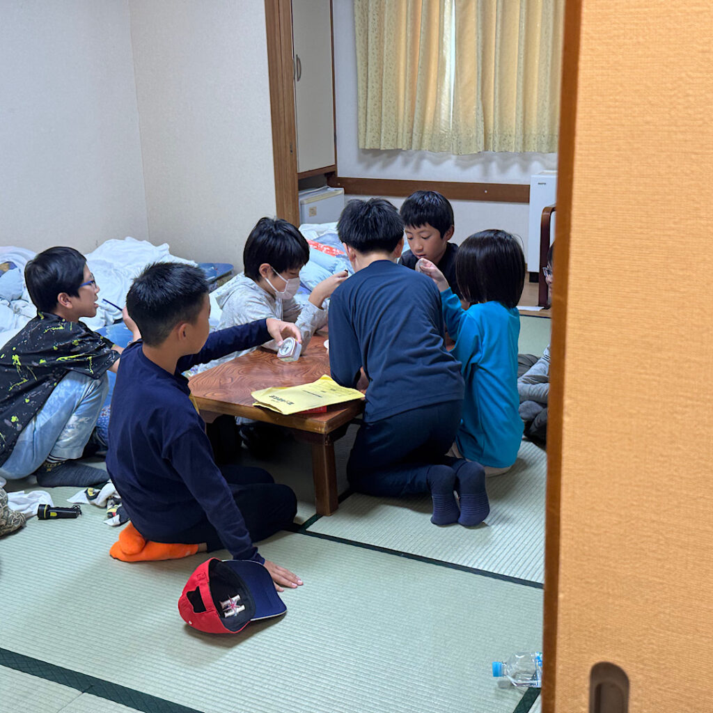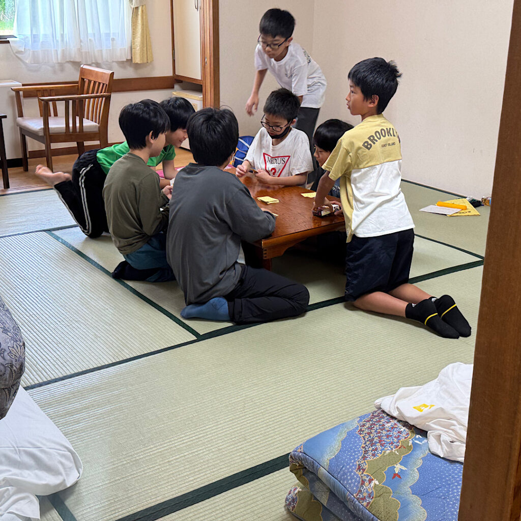 ハイキングから帰ってきてからは、お風呂タイムとお土産タイムを同時に行いました。その両方が終わった子どもたちは、お部屋での自由遊びの時間でした。先生方も交えてのカードゲーム大会や、私からは6年生にも伝授した「昭和の恋占い」を5年性にも伝えました。この時間はかなりゆとりのあったので、たくさんの子どもたちと楽しい交流ができました!