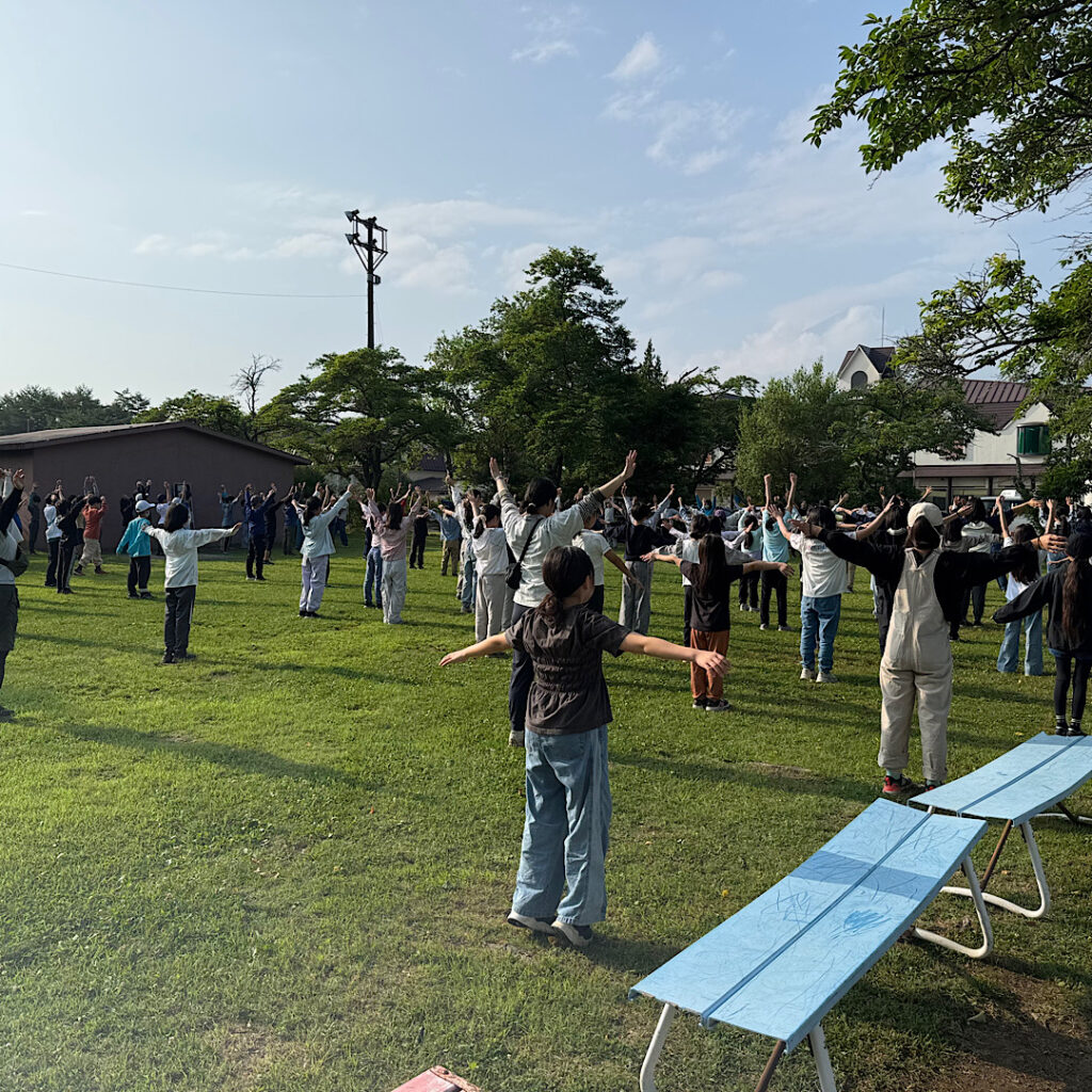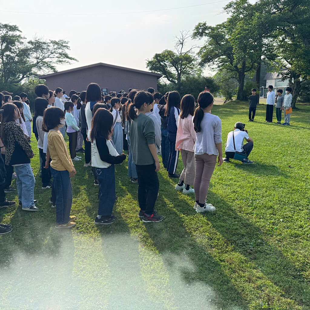 芝生の上で朝会をしました。時間より前に集合できて、先生から褒められていました。美味しく朝食を食べるためにもよい運動になりましたね。