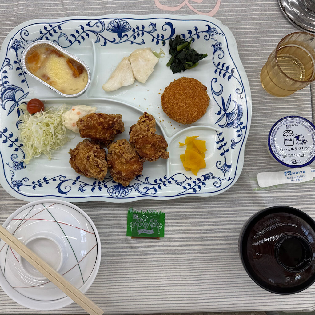 二日目の夕食です。唐揚げとコロッケ、グラタン等、ボリューム感たっぷりです。モリモリ食べている子が多く見られて、この後の体育館レクが楽しみです。