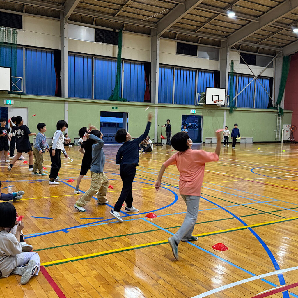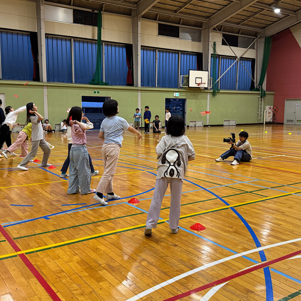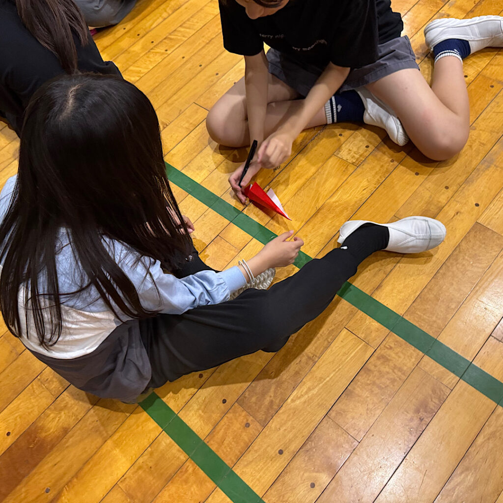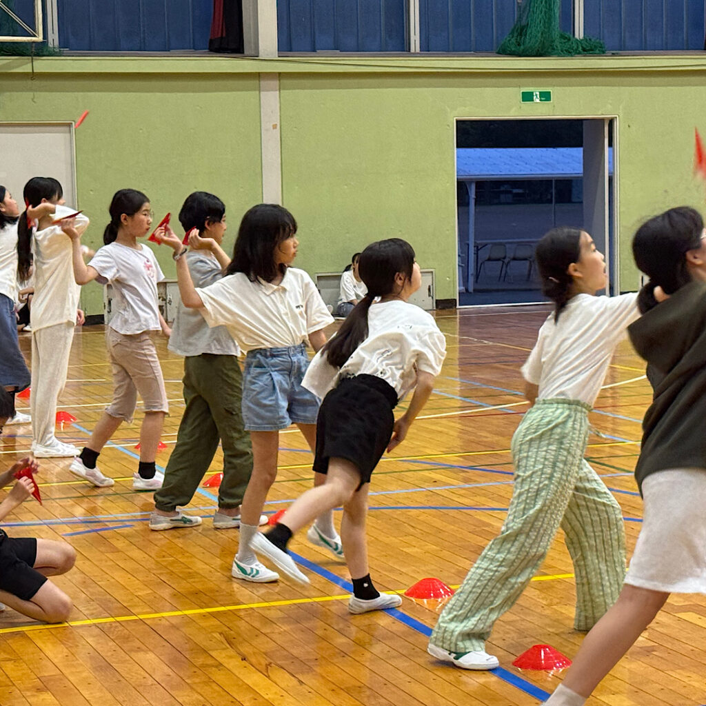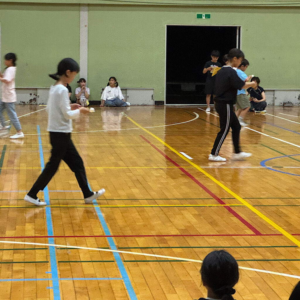 室内体育館レクの時間がやってきました。担当の子どもたちが司会進行を務めています。最初の種目は紙飛行機決定戦です。紙飛行機を作るところから始まり、遠くへ飛ばした方が勝ちというルールのようでした。