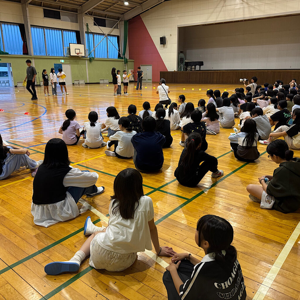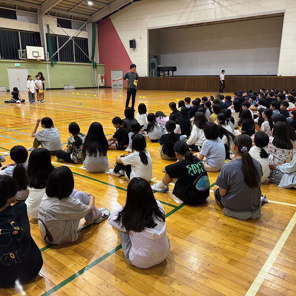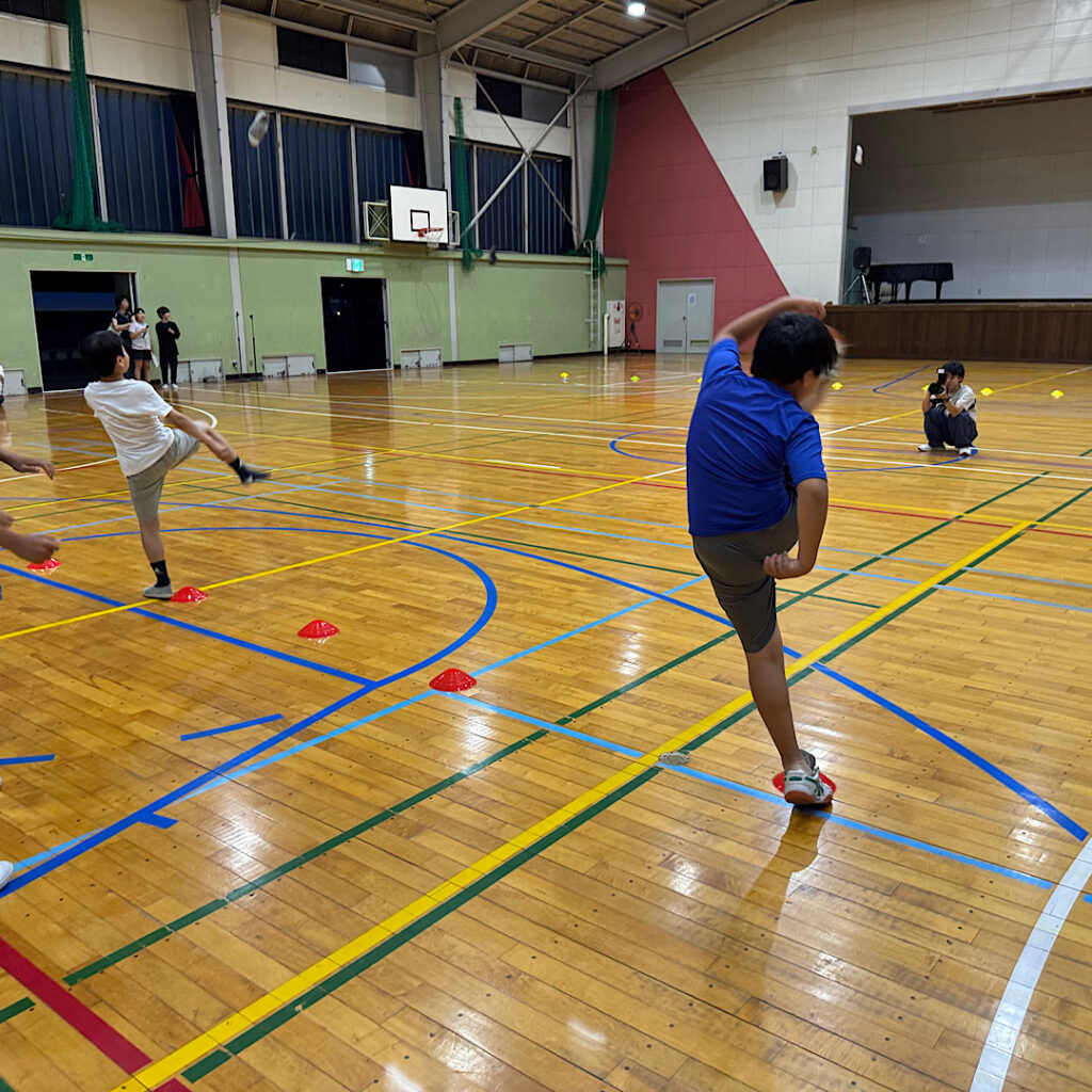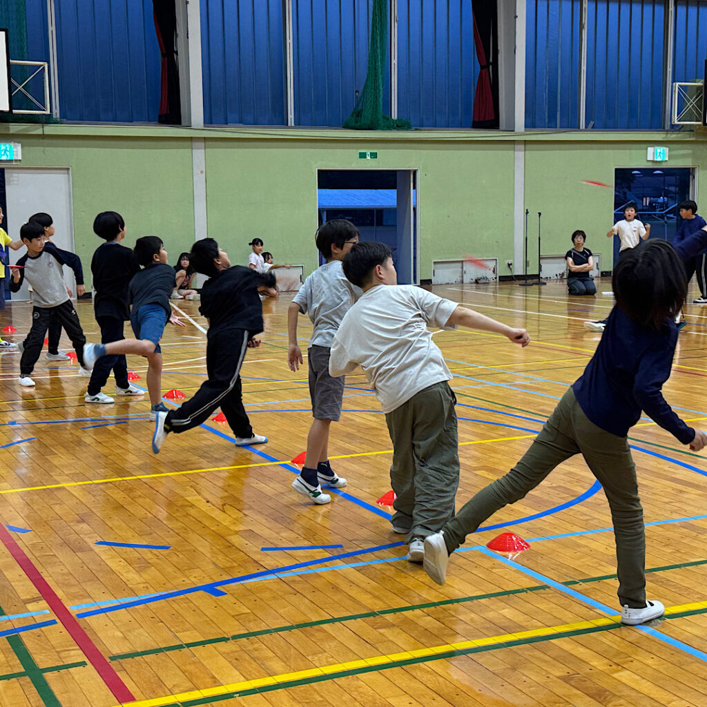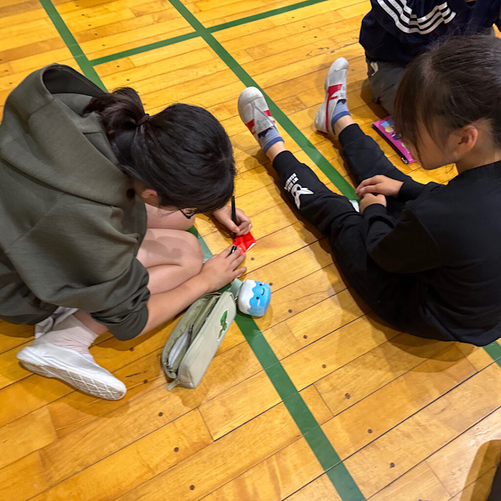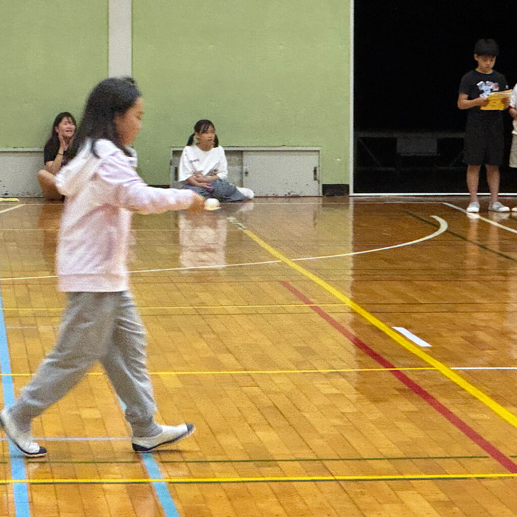室内体育館レクの時間がやってきました。担当の子どもたちが司会進行を務めています。最初の種目は紙飛行機決定戦です。紙飛行機を作るところから始まり、遠くへ飛ばした方が勝ちというルールのようでした。