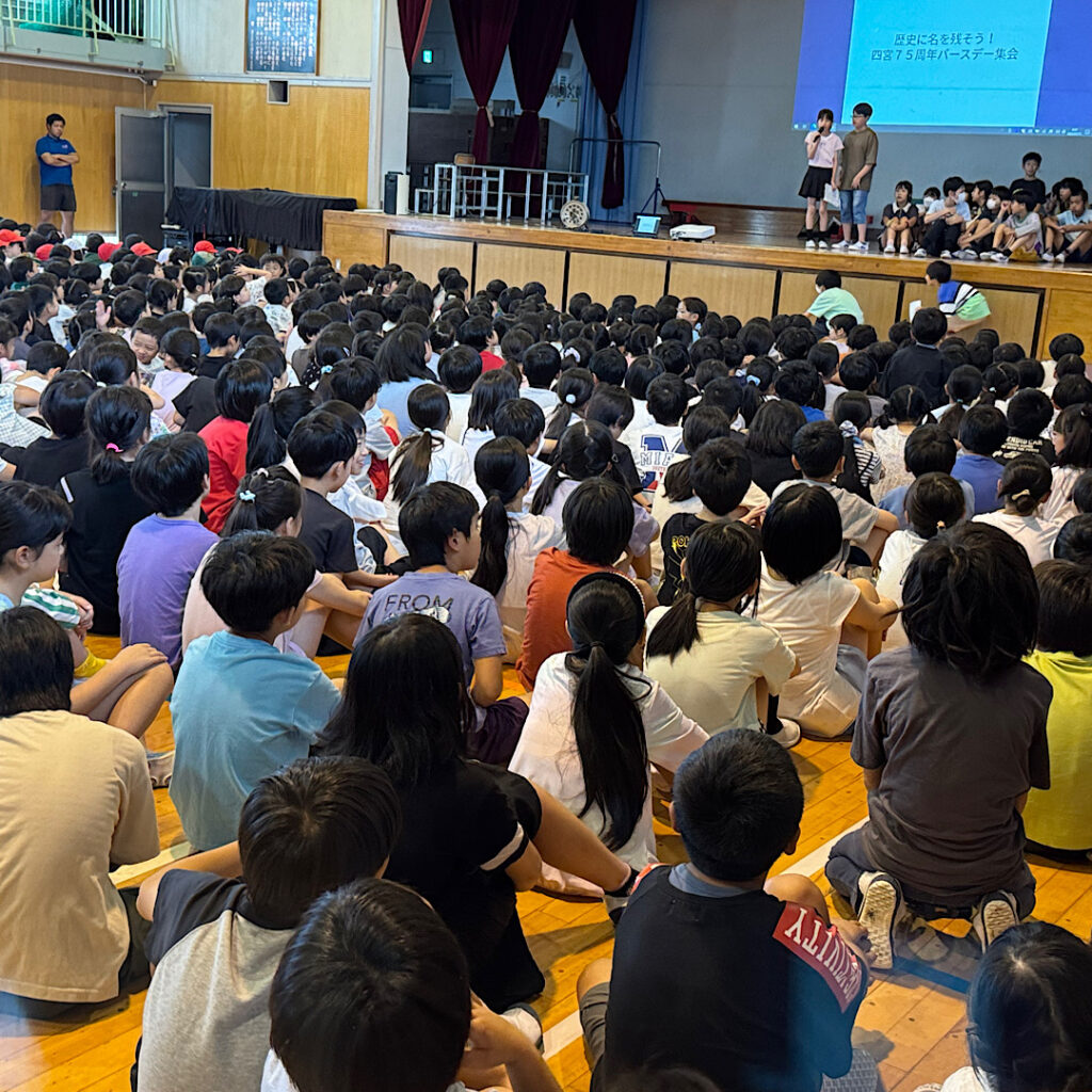 7月11日(金)の朝は全校児童が体育館にあつまり、四宮小75周年バースデー集会が開催されました。学校にまつわるクイズをみんなで楽しもうという内容でした。四宮小の先生方の数、第何代校長か、副校長先生の名前、トンボの像ができた年、ブランコの近くに埋まっているもの、西校舎の部屋数等集会委員会のみなさんのおかげで、四宮小のことをよく知ることができました。集会終了後、集会委員会担当の先生と子どもたちがしっかりと振り返りをしていたのが印象的でした。