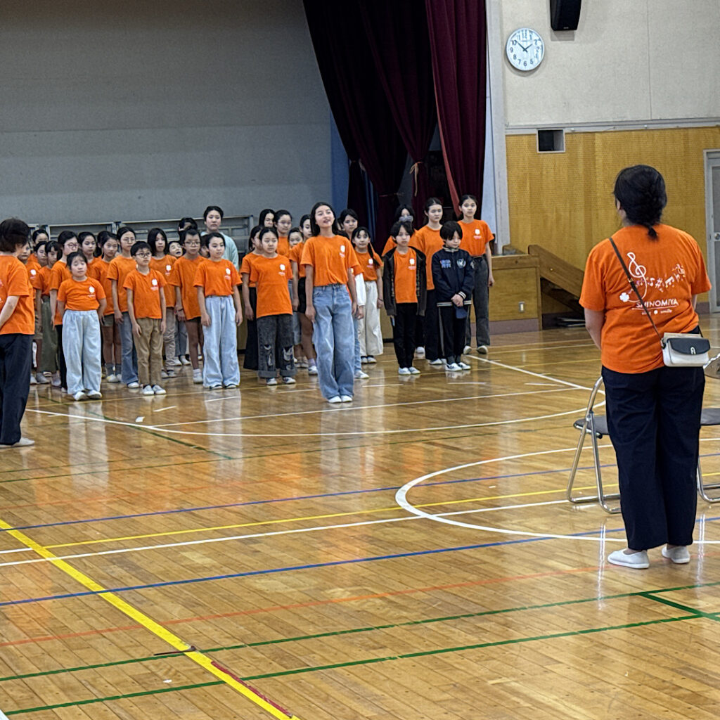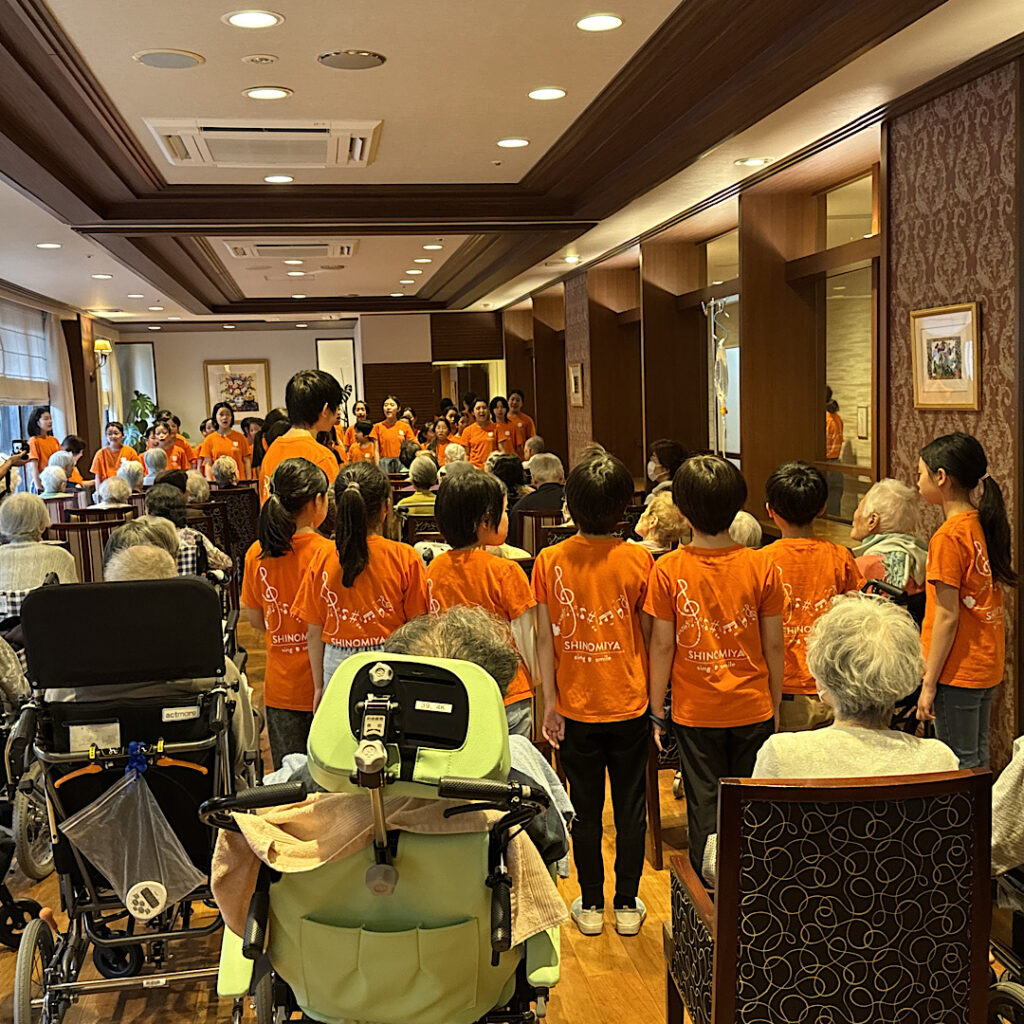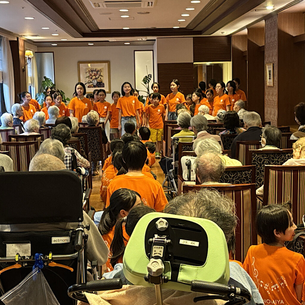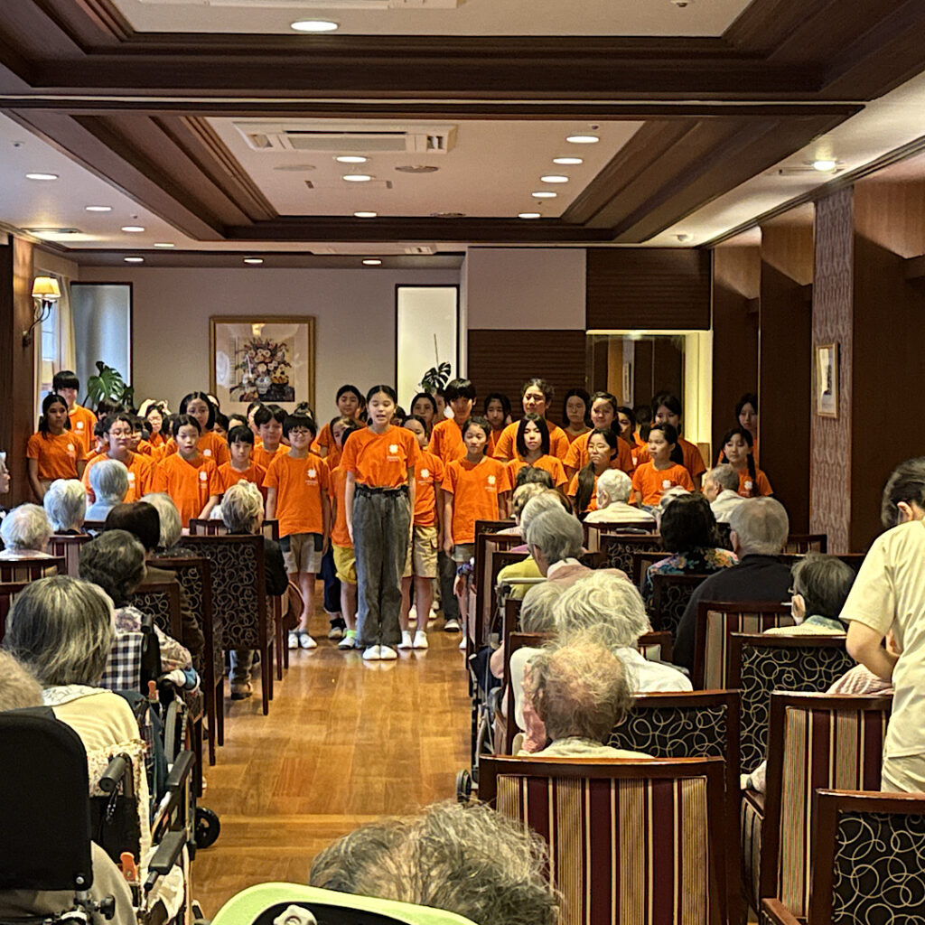 10月18日(土)四宮小合唱団の皆さんは、学校のすぐ南側にある老人ホームアリア上井草を訪問させていただきました。この交流活動はコロナ禍前からあったようで、昨年度辺りから復活したとのことでした。現地に行く前から体育館で練習をし、万全の状態で向かいました。とっても綺麗な施設の中で子どもたちは歌わせていただき、聴いてくださったホームの皆様は涙を流している方や一緒に歌ってくださる方もいて、心を込めて聴いてくださっているように感じました。四宮小の子どもたちを誇りに思うと共に、素敵な時間を共有することができ幸せなひと時を過ごさせていただきました。