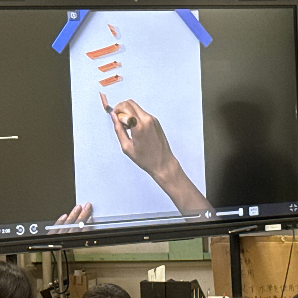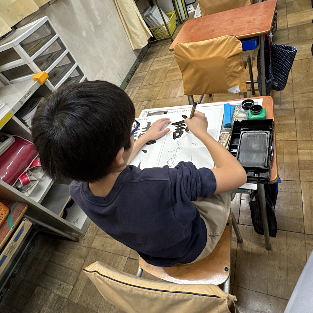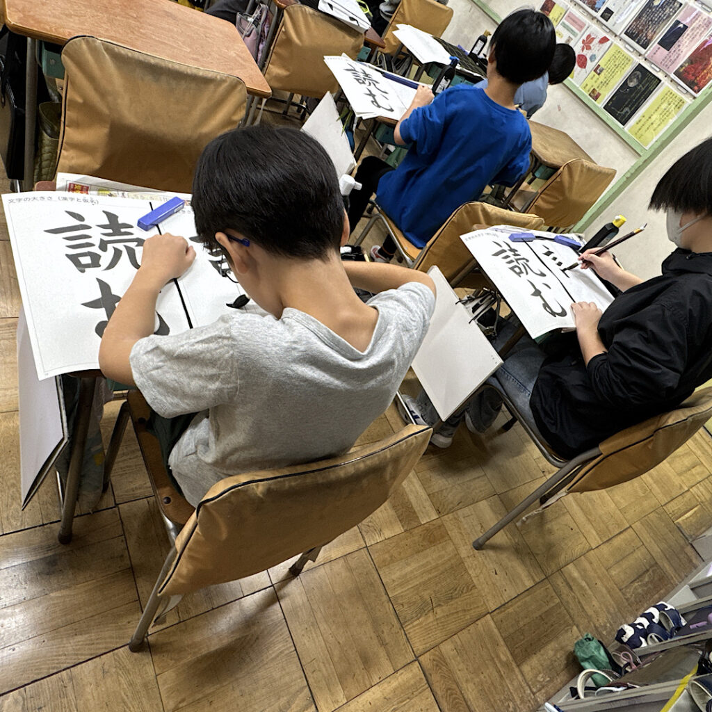 、10月24日(金)の5校時、5年3組の教室では書写の学習が行われていました。この日の課題は「読む」です。漢字と平仮名の混ざった字は今学期か今年度かわかりませんでしたが、初めてのようでした。最初に「む」の大きさを変えた3つの読むを見てどれが一番良いか子どもたちに聞くと、ちゃんと正しい「読む」を選んでいました。平仮名の方を少しだけ小さく書くと良いということを子どもの発言から出てくるのが素晴らしいと思いました。その後動画資料で書き順を確認した後、いよいよ書き始めました。書き始めると驚くほど集中して静かに書いている姿が印象的でした。日本の伝統文化である書写を、こうやって学ぶ子どもたちを見ると何だか嬉しくなりました。