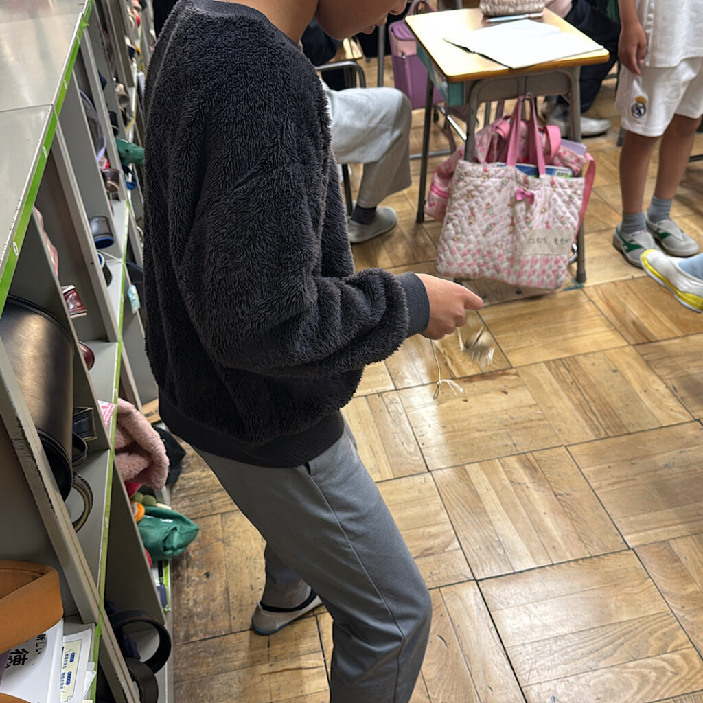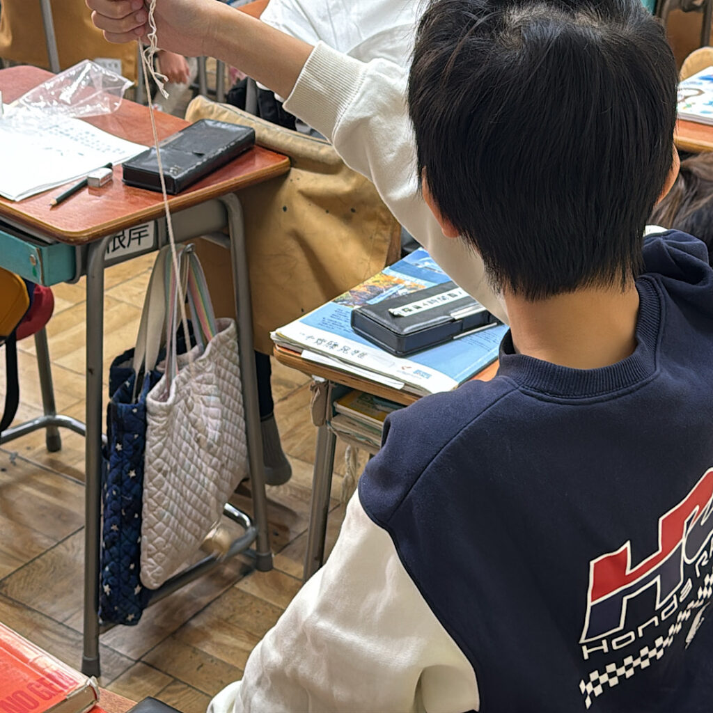 おもり11月19日(水)の2校時の5年4組の教室では、理科の学習が行われていました。一人一個、紐とおもりをもらい流れてきた音楽に合わせてふりこのスピードをコントロールするという活動でした。曲調によってスピードが変わるので、子どもたちは夢中になって紐の長さや動かし方を工夫していました。とっても楽しそうな単元の導入で、今後の学習に意欲的に取り組めそうな様子が想像できました。