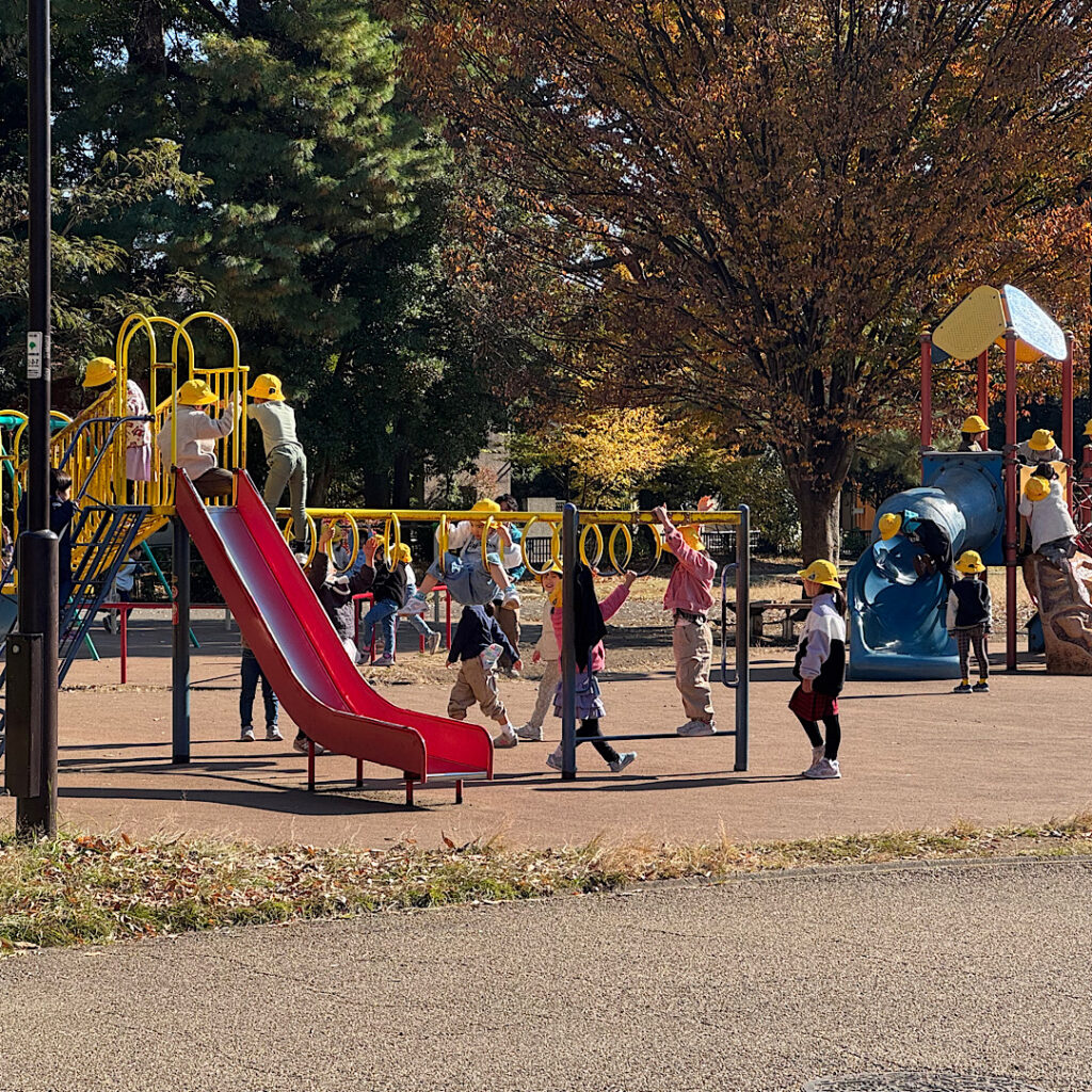 どんぐり拾いの一方、遊具で遊ぶ時間もありました。井の頭公園の西広場には、魅力的な遊具がたくさんあって、子どもたちは夢中になって遊んでいました。