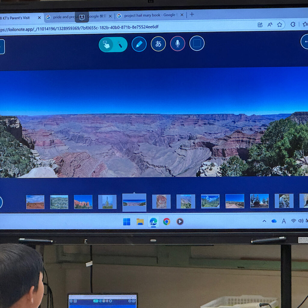 12月9日(火)2校時の5年4組では、外国語の授業が行われていました。この日はALTの先生のご両親が来日されていて、子どもたちが直接質問をしたり話をしたりしました。日本の良さを紹介する活動もあり、最後には自作のプレゼントを渡していました。子どもたちにとっては英語を話す必要感があり、貴重な学びの機会となりました。これからの時代に必要な力を身に付けていくのですね。