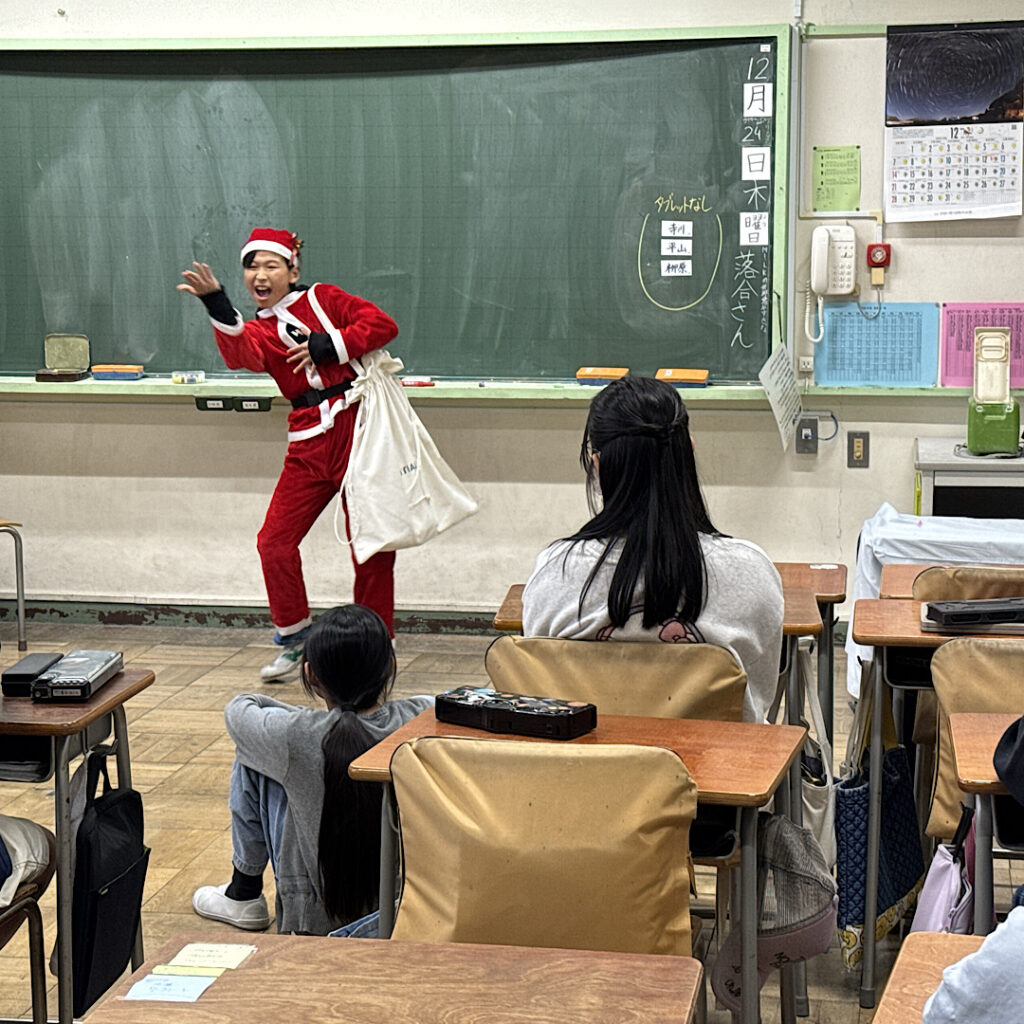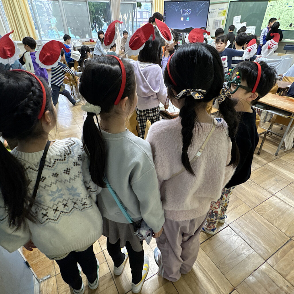 もりあがって12月24日(水)は、各学級でお楽しみ会が開かれていました。ミニサンタさんがいたり、トナカイ風な衣装がいたり…。まさに子どもたちが主体となり、自分たちで楽しい時間を作っているのがいいなぁと思いました。6年4組では探偵ゲームで盛り上がっていました。6年3組ではクイズやダンスをしているのを見せてもらいました。5年2組ではお店屋さんがたくさん出ていました。4年1組では新聞ゲームを楽しんでいました。2年2組では輪になって探偵ゲームをしていました。1年4組では素敵なダンスチームが踊った後でした。クローバー学級では百人一首で坊主めくりをしていました。2年1組では玉入れゲームという初めて見るゲームを楽しんでいました。きっと明日も楽しい時間があるのではないかと期待しています。