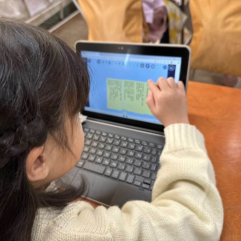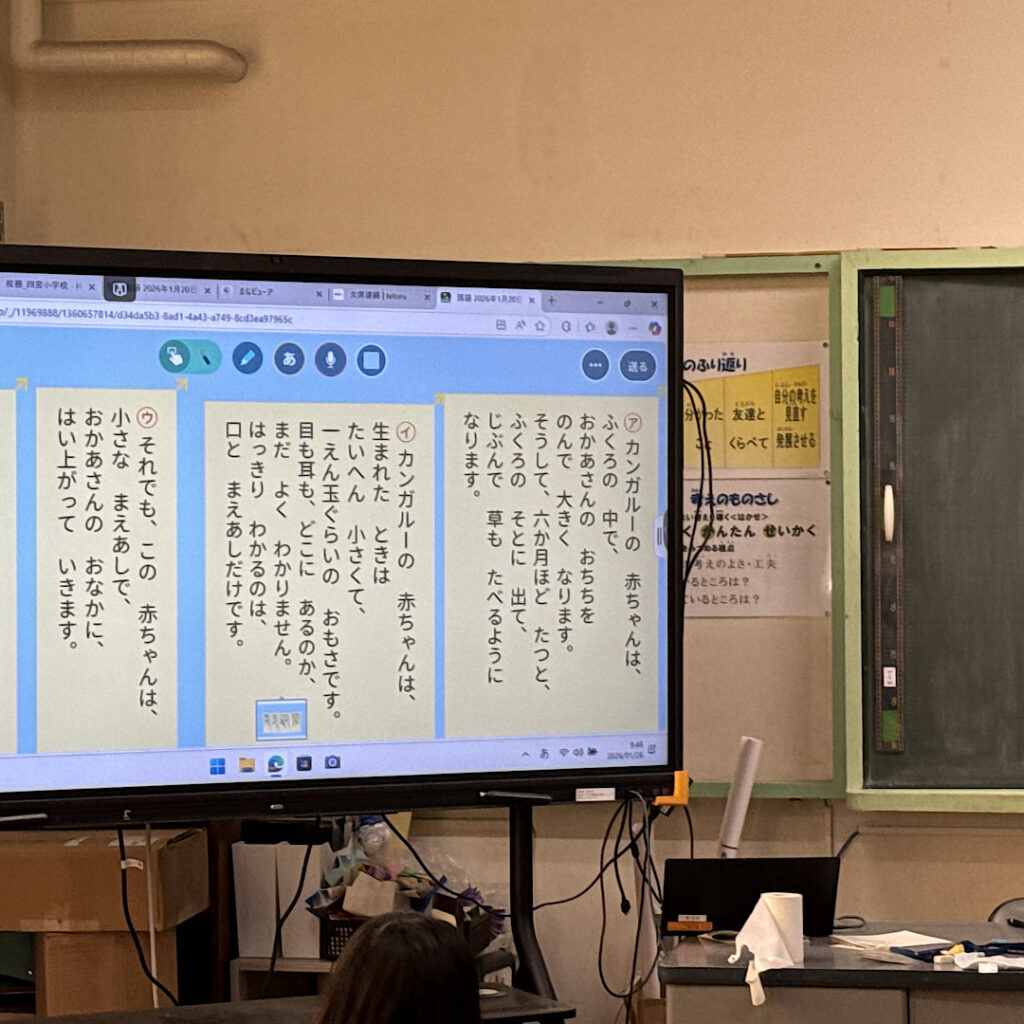 1月26日(月)2校時の1年3組の教室では、国語の学習が行われていました。一年生の子どもたちが一人一台のタブレット端末を使い、文章の並べ替えをしていました。ロイロノートで先生から送られてきたシートに指で気付いたことやわかったことを記入していて、一人一人が頭を悩ませながら考えていました。後半では自分が書き込んだシートを先生に送って、友達の考えを一共有していました。一年生なりの個別最適な学びと協働的な学びの一体化された授業を見ることができました。