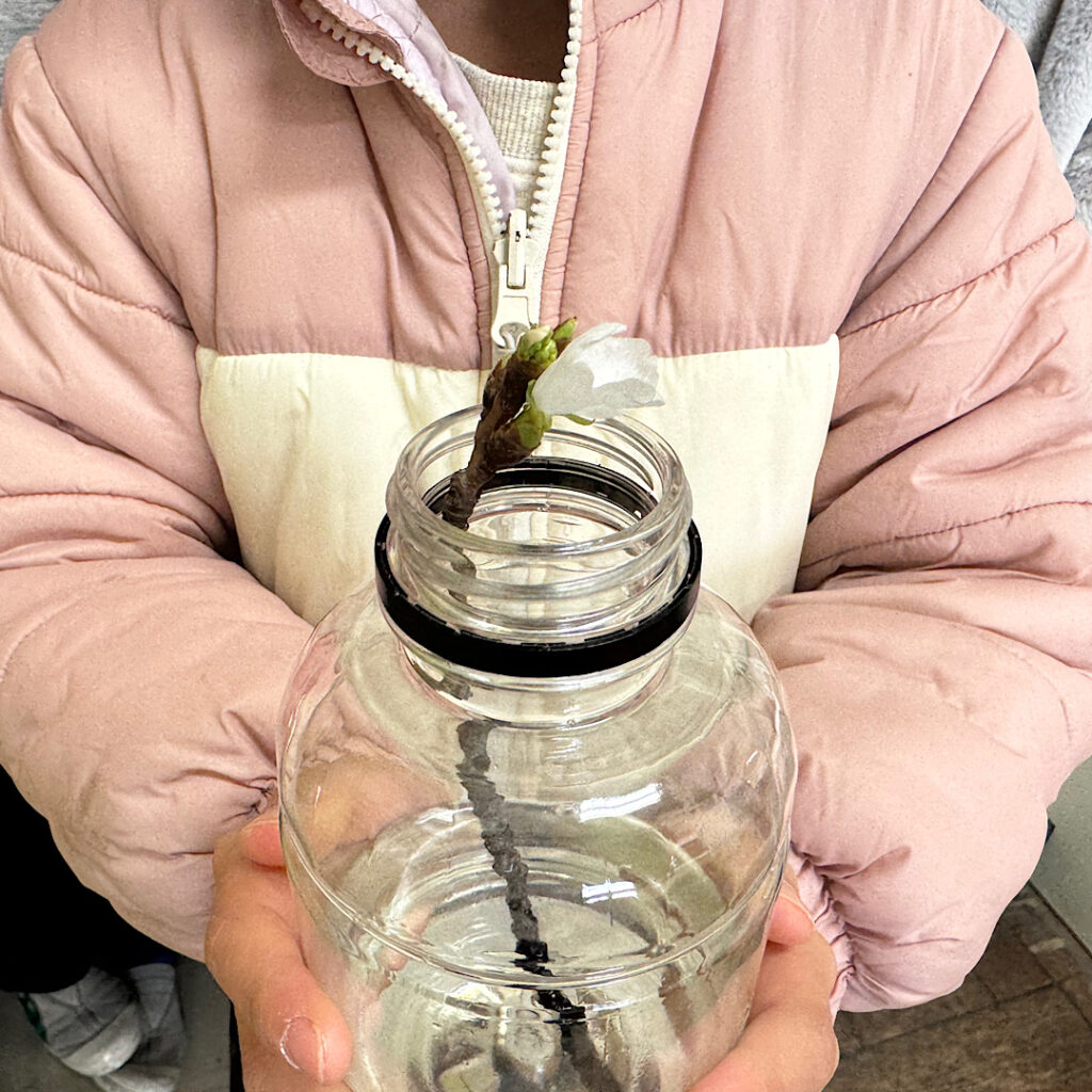 2月9日(月)の1時間目に、2年4組の子どもたちが校長室にやった来てくれました。代表の子が持っていたのは小さな桜の枝でした。何とその蕾の一つが咲いていたのでした。校庭には雪が残っているくらい寒い中で、一輪だけ咲いている桜の花びらに感動しました。何よりそれを嬉しそうに見つめる子どもたちの姿が印象的でした。
