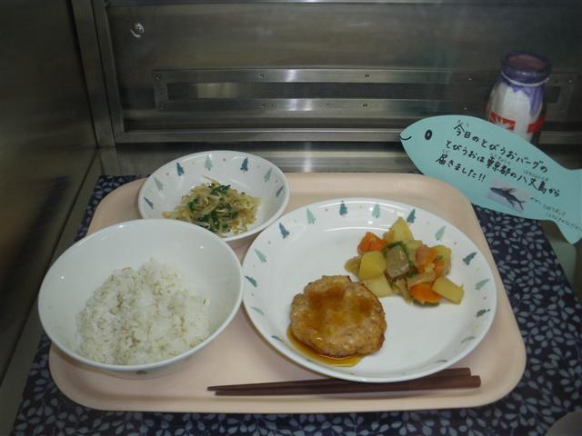 東京都八丈島から届いたとびうおのミンチを使用しました。豚肉と豆腐も一緒に混ぜてふんわり焼き上げました。魚の形のカードを各クラスに配り、お知らせをしました。子どもたちは魚に気付かず残菜もなくよく食べました!